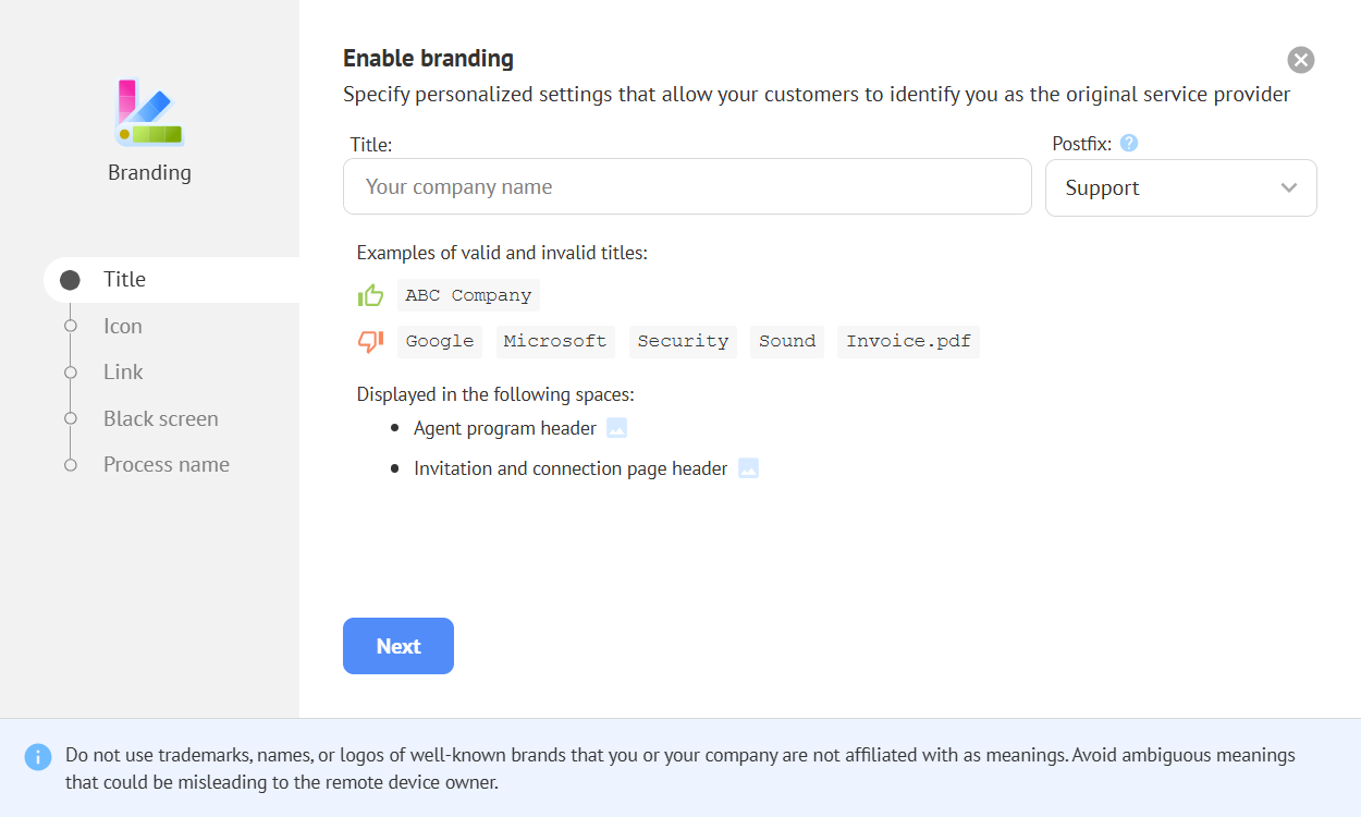 Branding is the partial alteration of the software's interfaces using a corporate style. Your customers will receive invitations and agent files with your company's logo and name. This increases customer loyalty and trust in the software being used.
