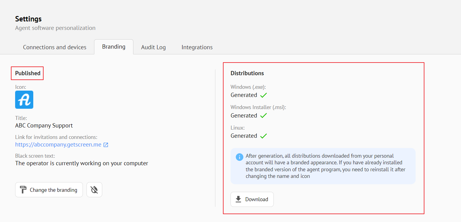 Branding settings do not apply to previously downloaded and installed agent programs. After changing the settings, you must update them manually. For the operating system, the branded version is different from the previous one and is independent of the original.