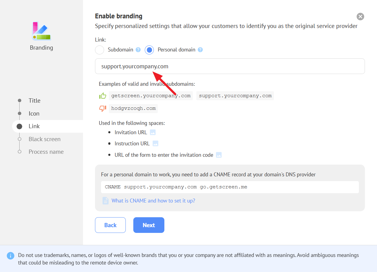 You can use your own corporate domain for connection links and client invitations. This feature helps build customer trust and is especially useful for medium and large businesses.