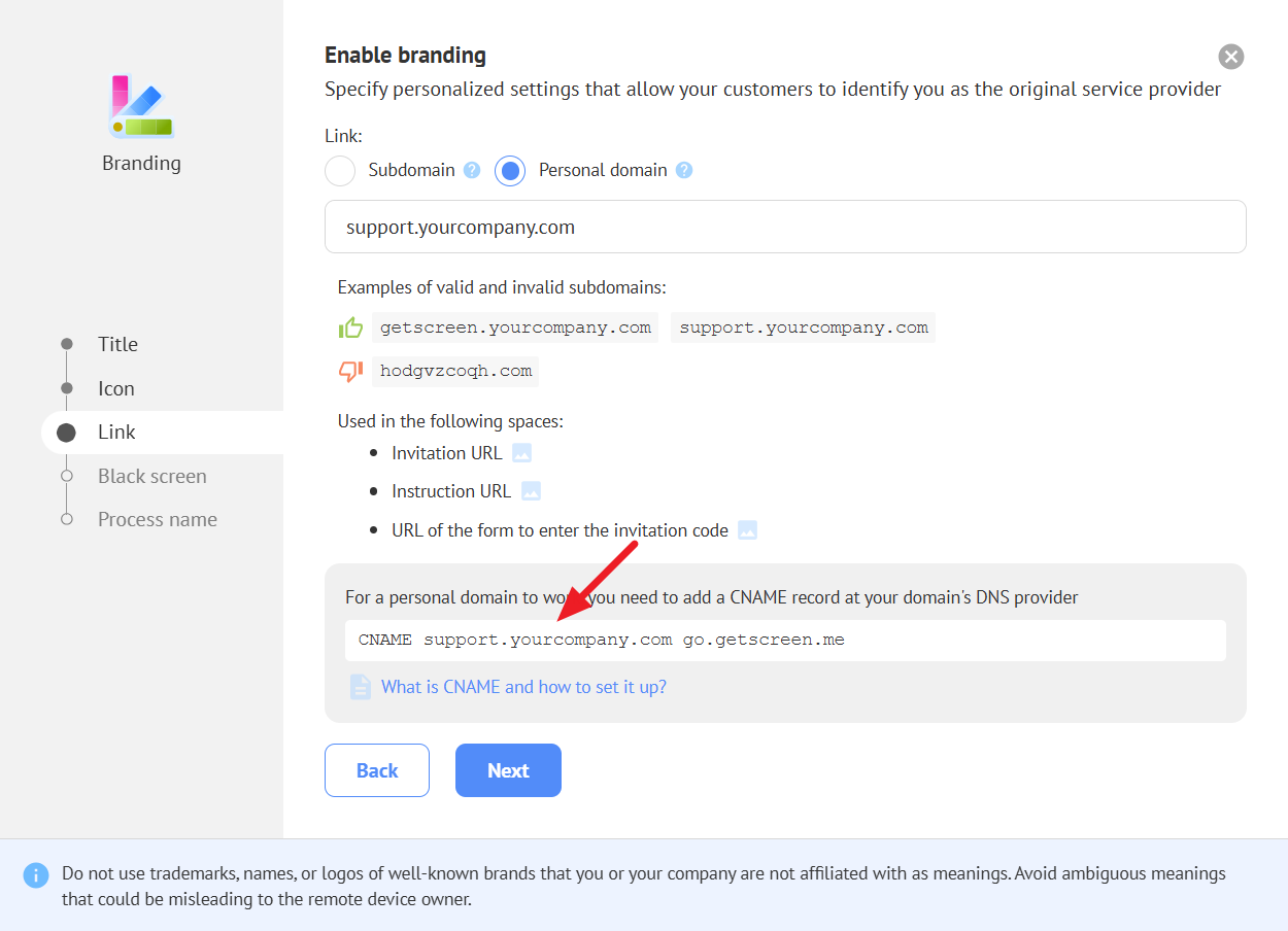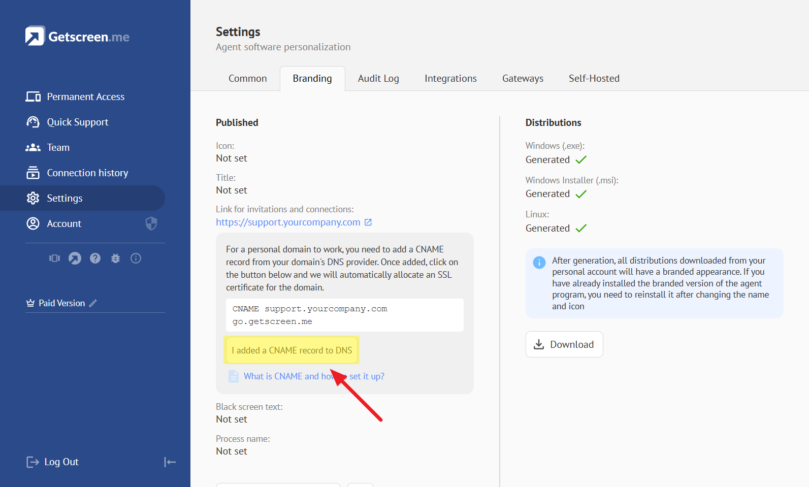 Go back to the Branding Settings window and click the button I added a CNAME record to DNS.