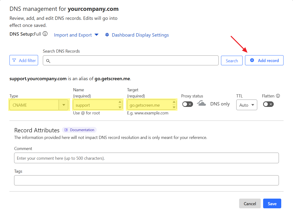 Here’s how the record CNAME support.yourcompany.com go.getscreen.me would look in table form: