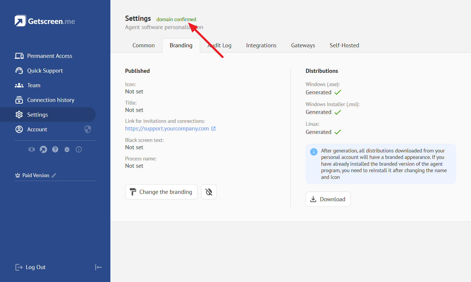 Once the record is added, go back to the Branding Settings in your dashboard and confirm the setup.