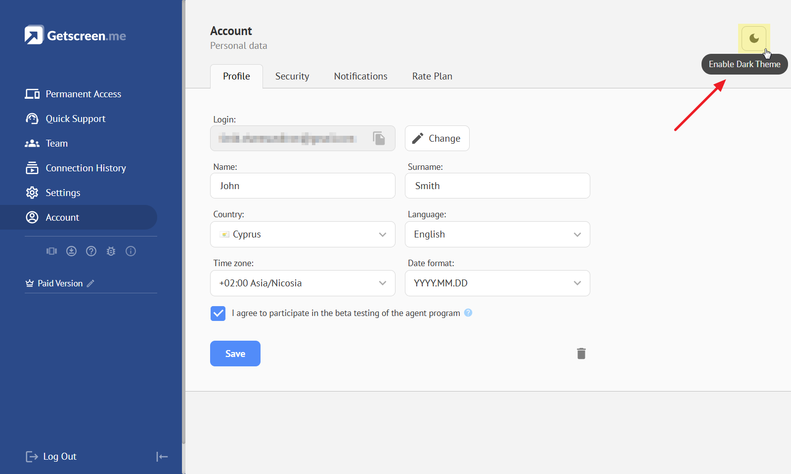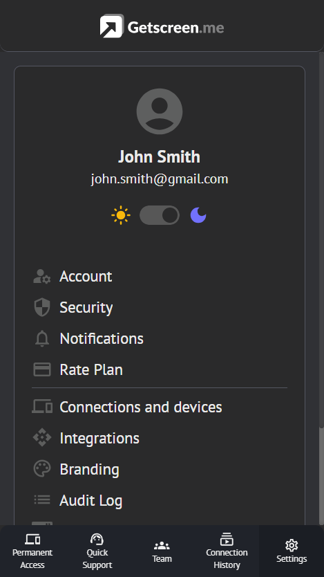 When connecting to a device from the interfaces described above, the selected theme is automatically applied to the connection window. However, if you connect not from the personal account but via an external link (a one-time link, a permanent link, or a link from an HTTP API integration), the dark theme must be enabled manually.