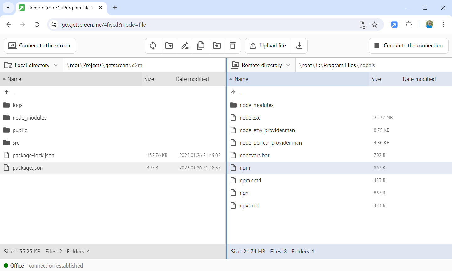 Now you can use the new File Manager connection mode for working with files. In this mode, instead of a screen image, you'll see a dual-pane interface with file lists, similar to desktop programs like Far Manager, Total Commander, and others. In the left pane, you select the local directory of the computer you are connecting from, and in the right pane, the directory from the remote device. After that, you can move and copy files between them, and more.