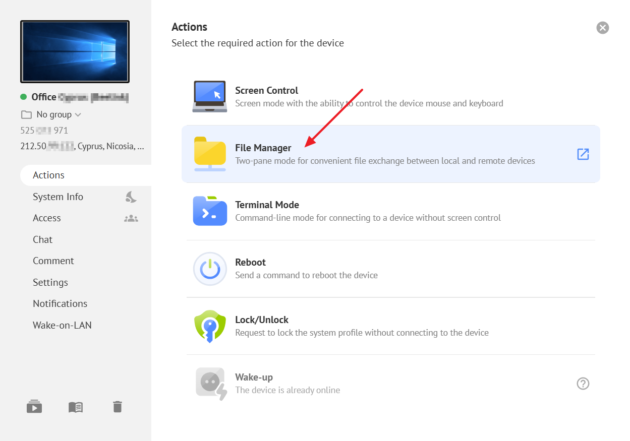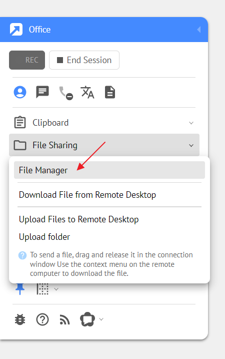To use the File Manager mode, it is necessary that it is supported by the agent program running on the remote device and the browser used for the connection.