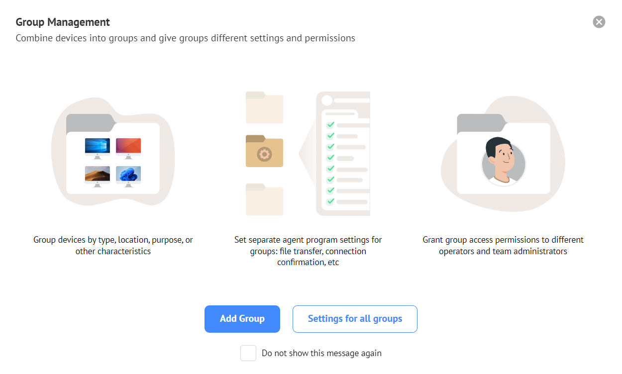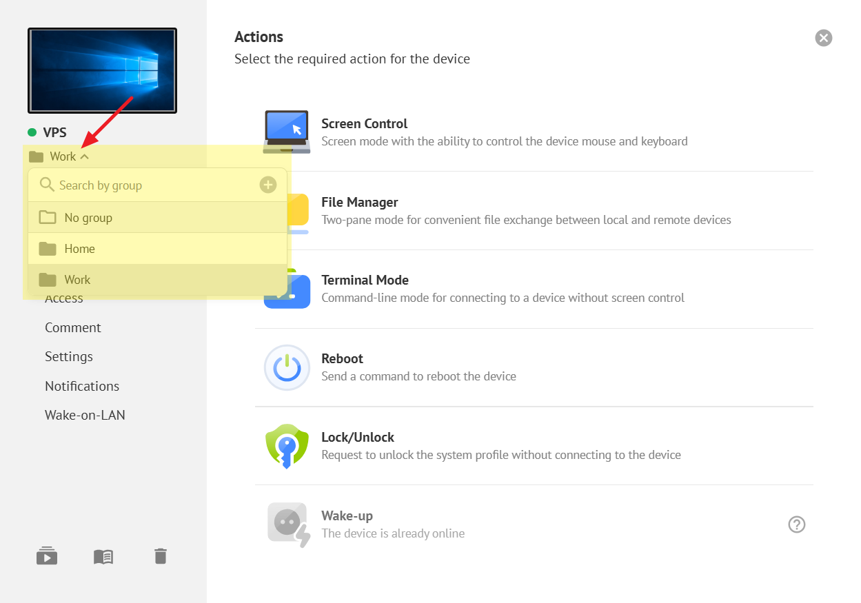 When there are more than a dozen remote devices in permanent access, there are difficulties in accounting and managing them. To solve these issues, you can group devices together, assign them by purpose, set group settings, and grant individual group access rights.