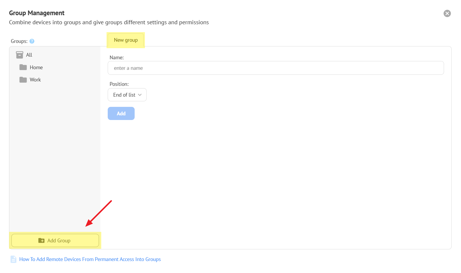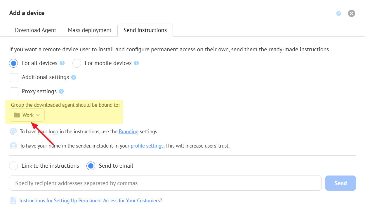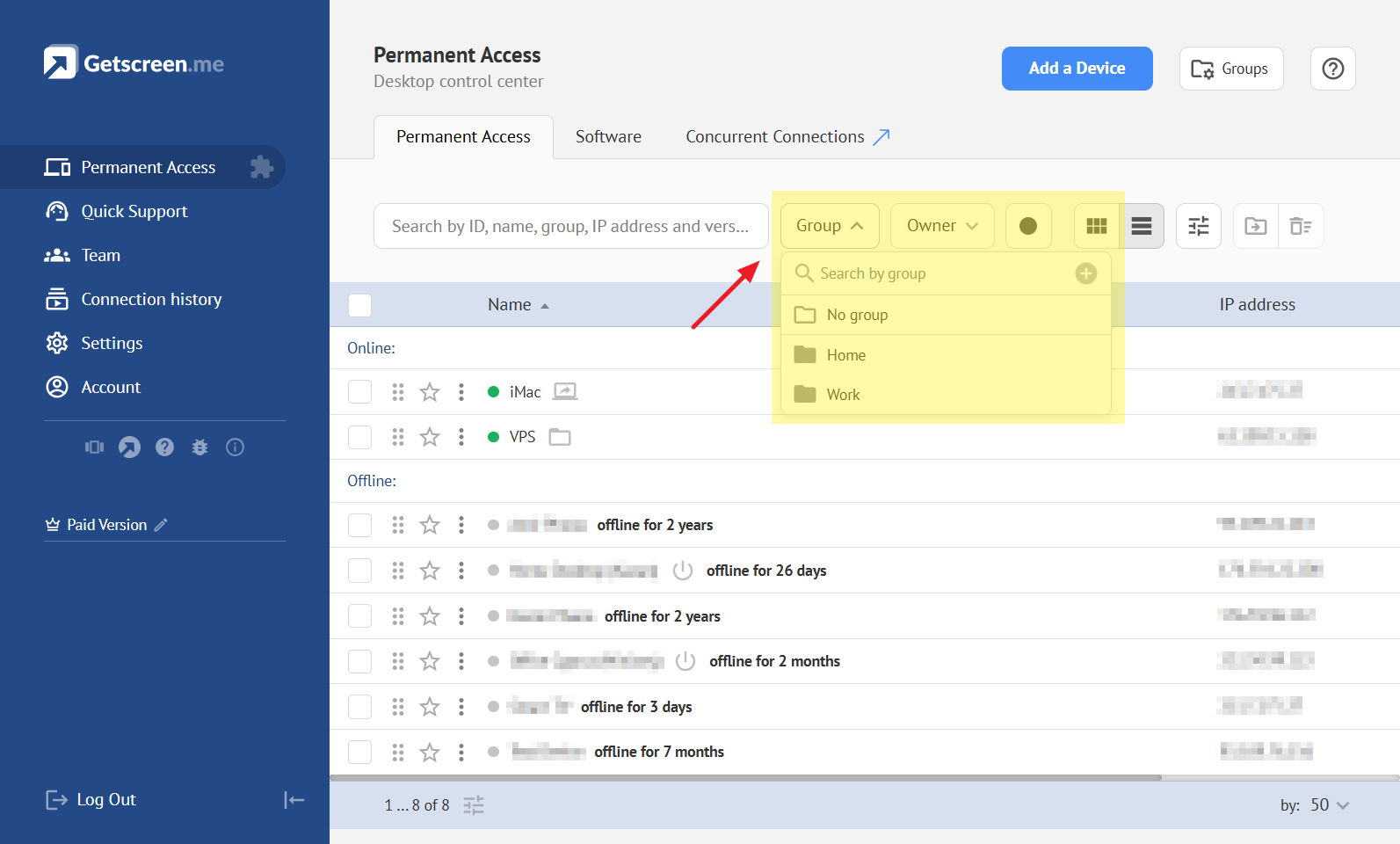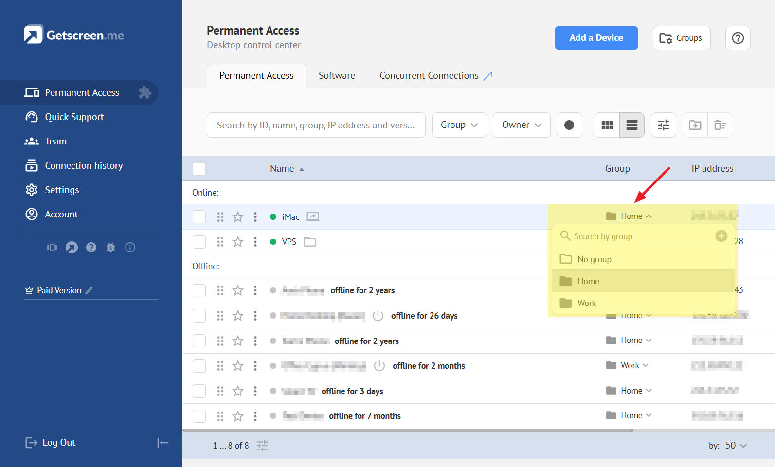 The account owner can categorize agents into groups, for example, by company or department name. This will help you find the right device to connect to and provide assistance faster.