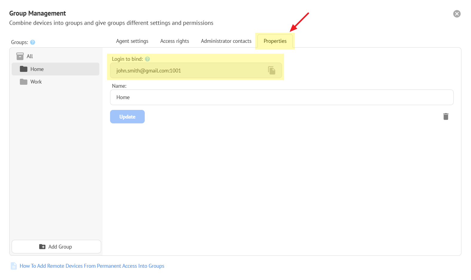 Select the desired group, copy the login, paste it into the agent program and give Permanent Access.