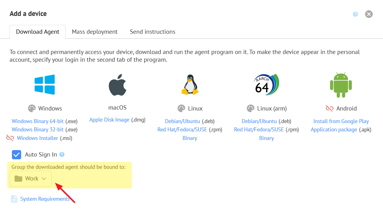 You can also specify the group when downloading the agent program in your personal account: