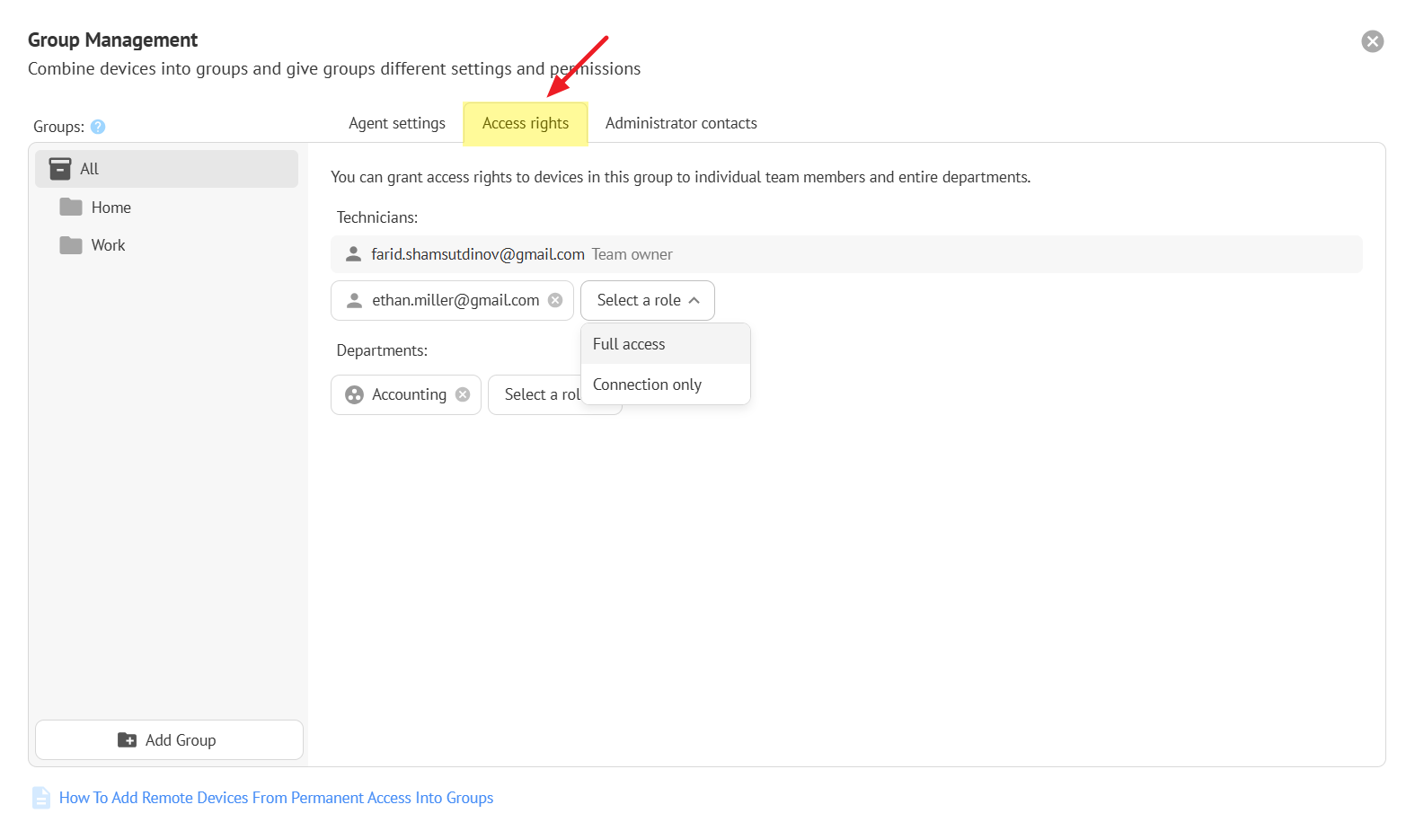 The account owner can grant access rights to devices from the group to individual team members. To do this, select a team technician and assign a role.