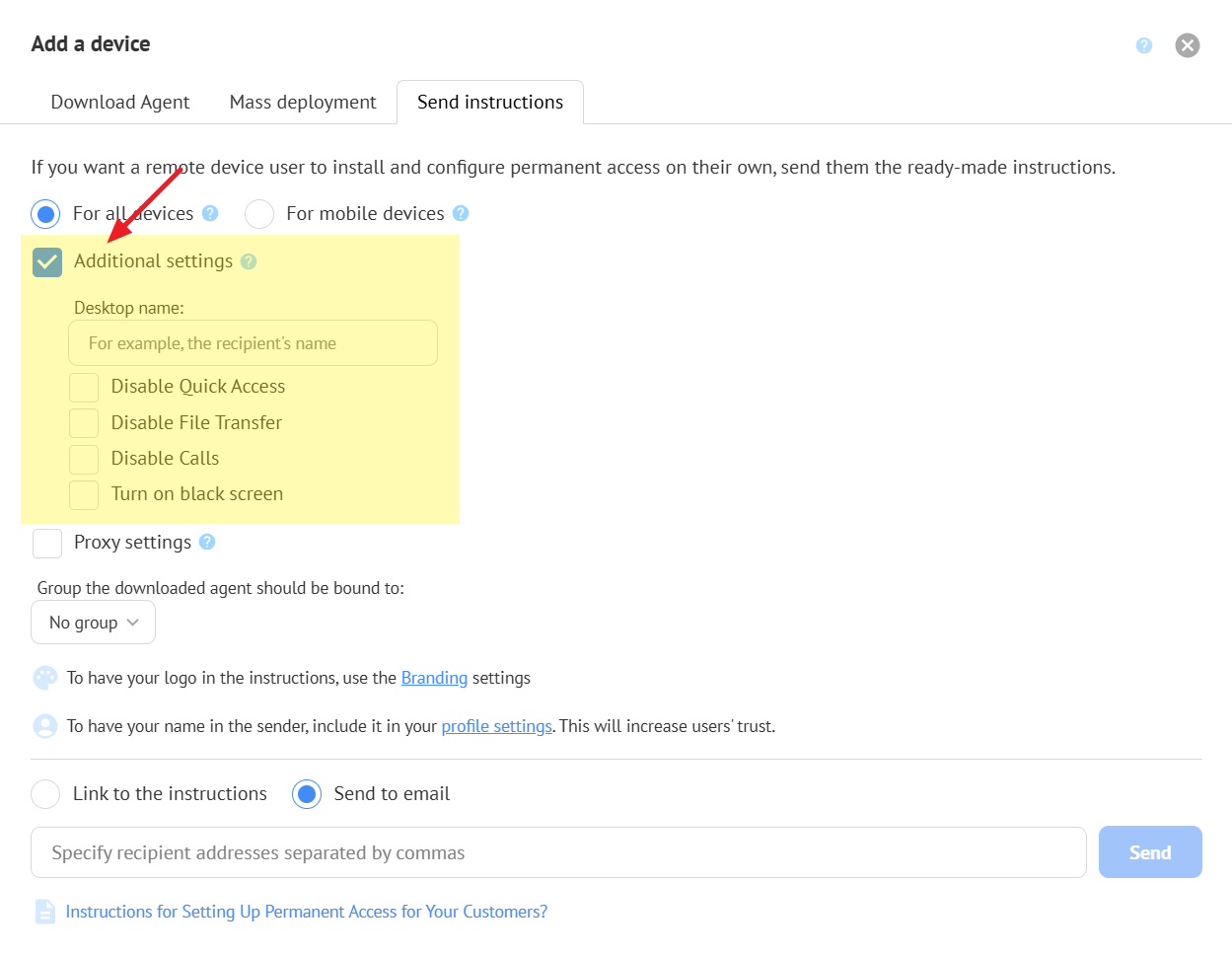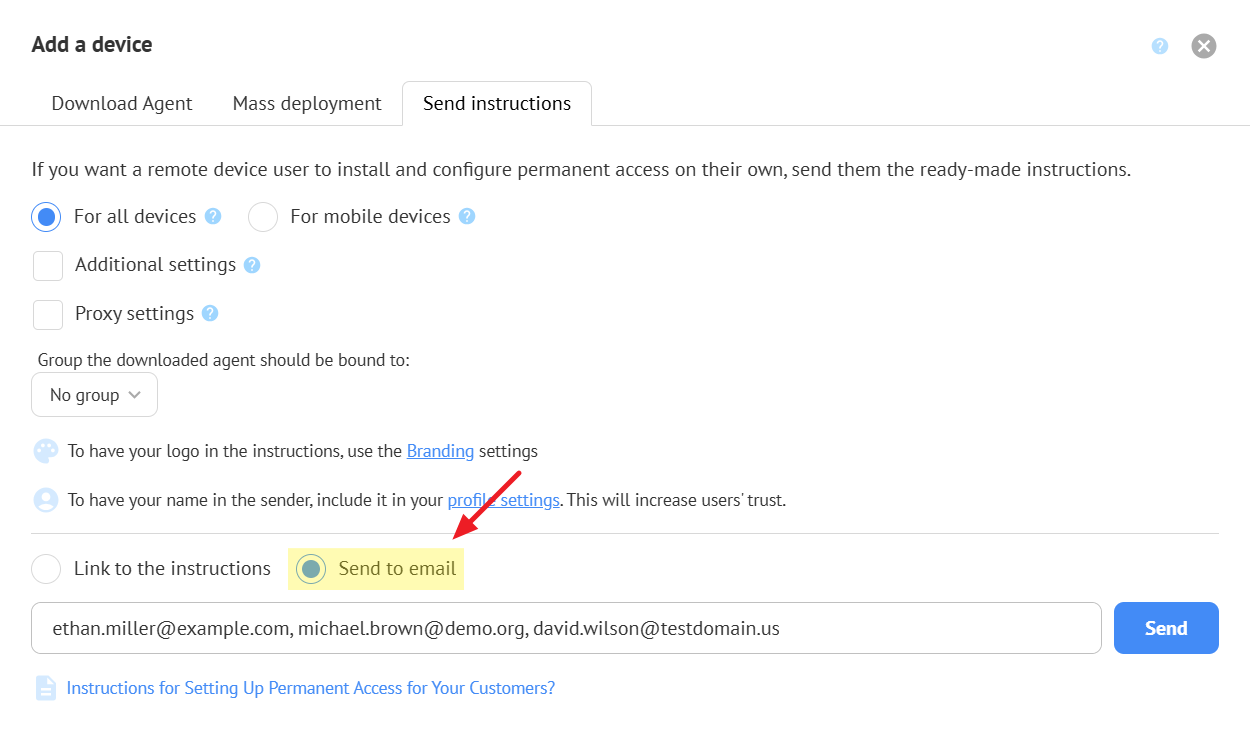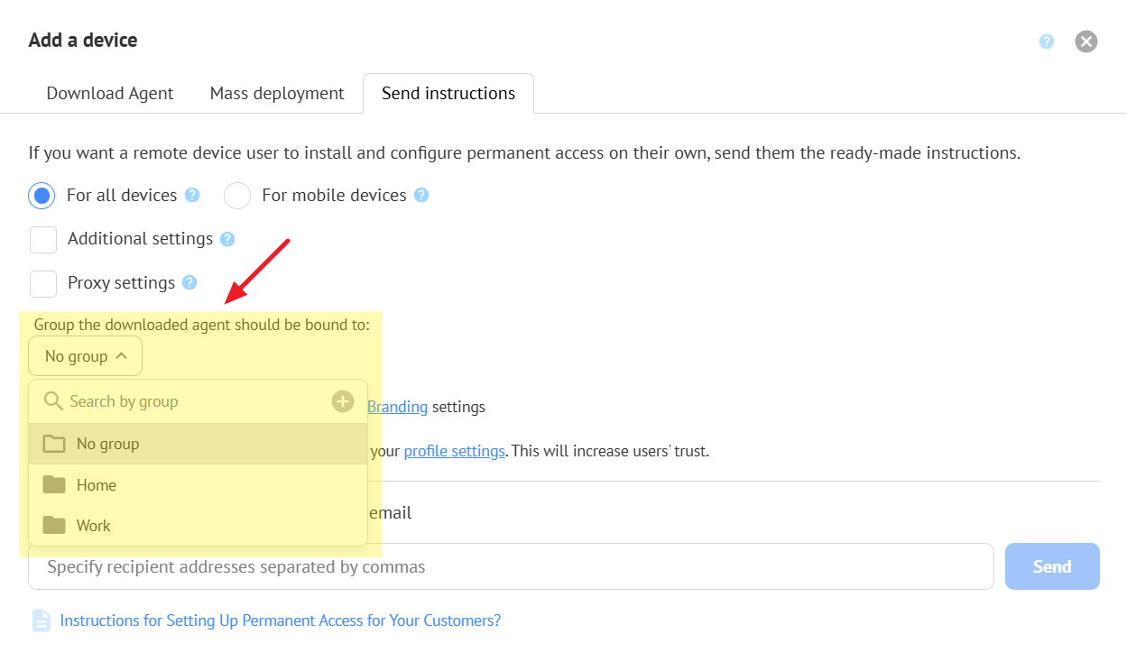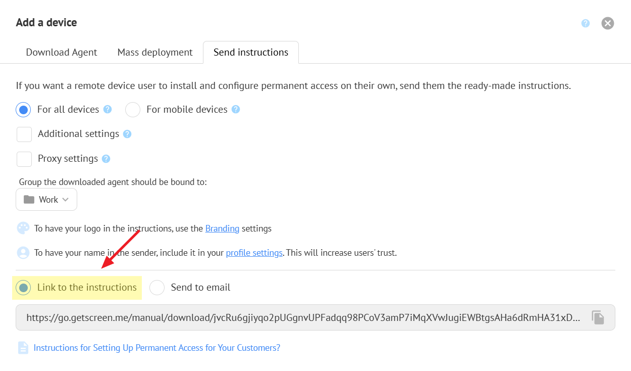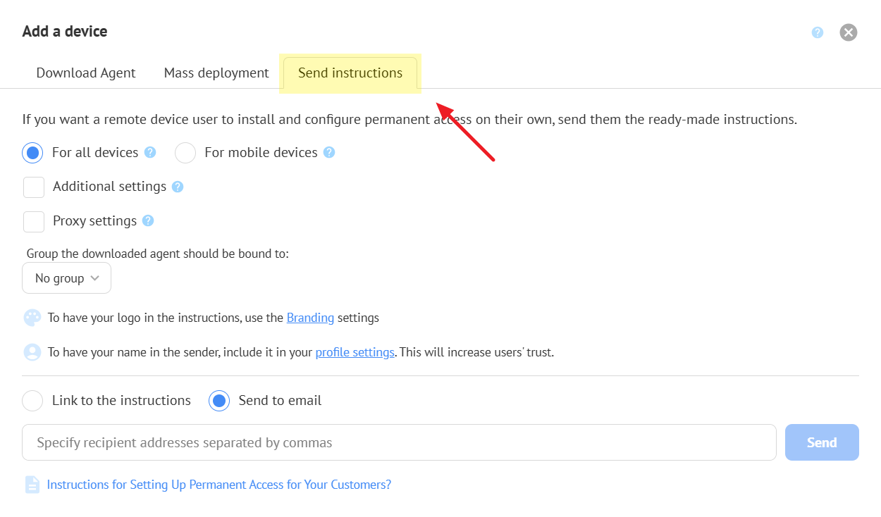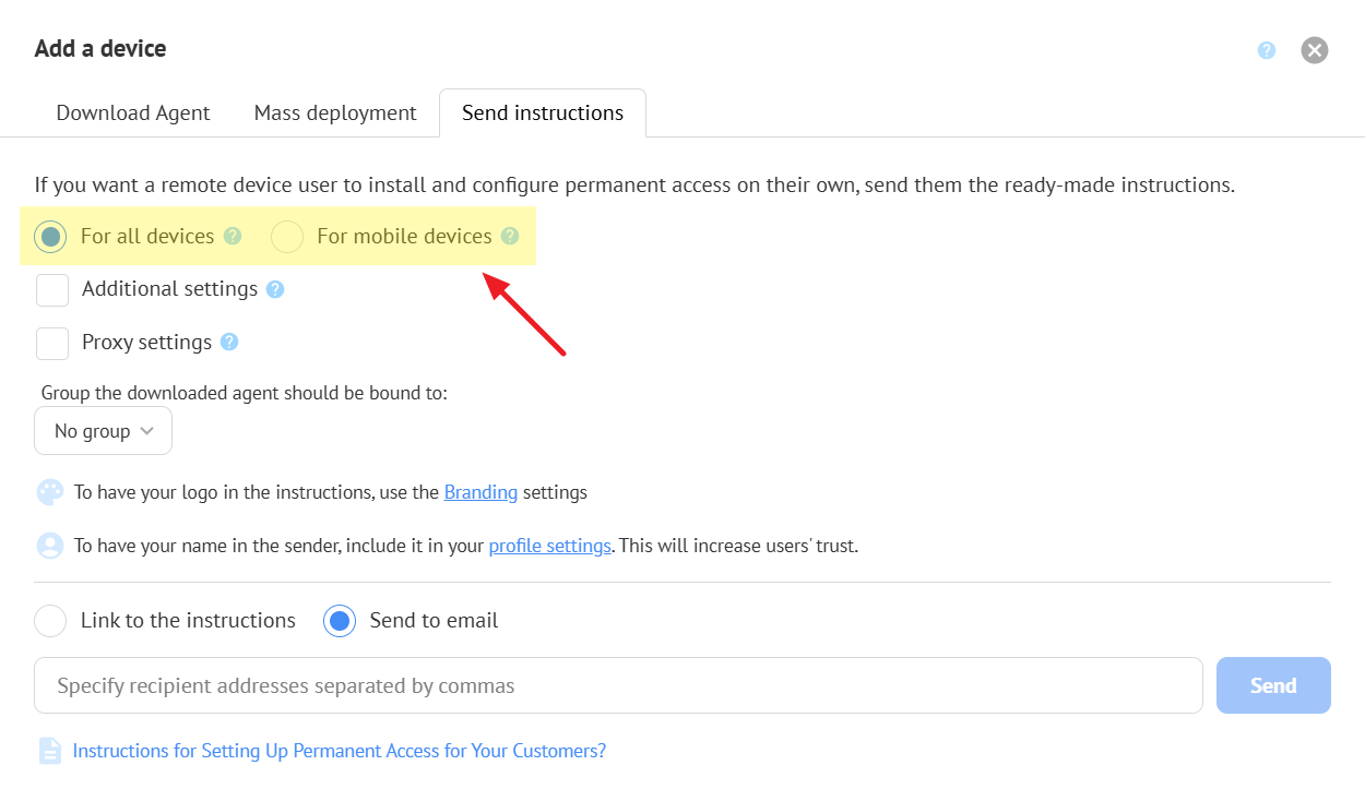 To set up remote access to a computer, select a connection for any devices. The instruction is automatically adjusted for the client's operating system and browser.