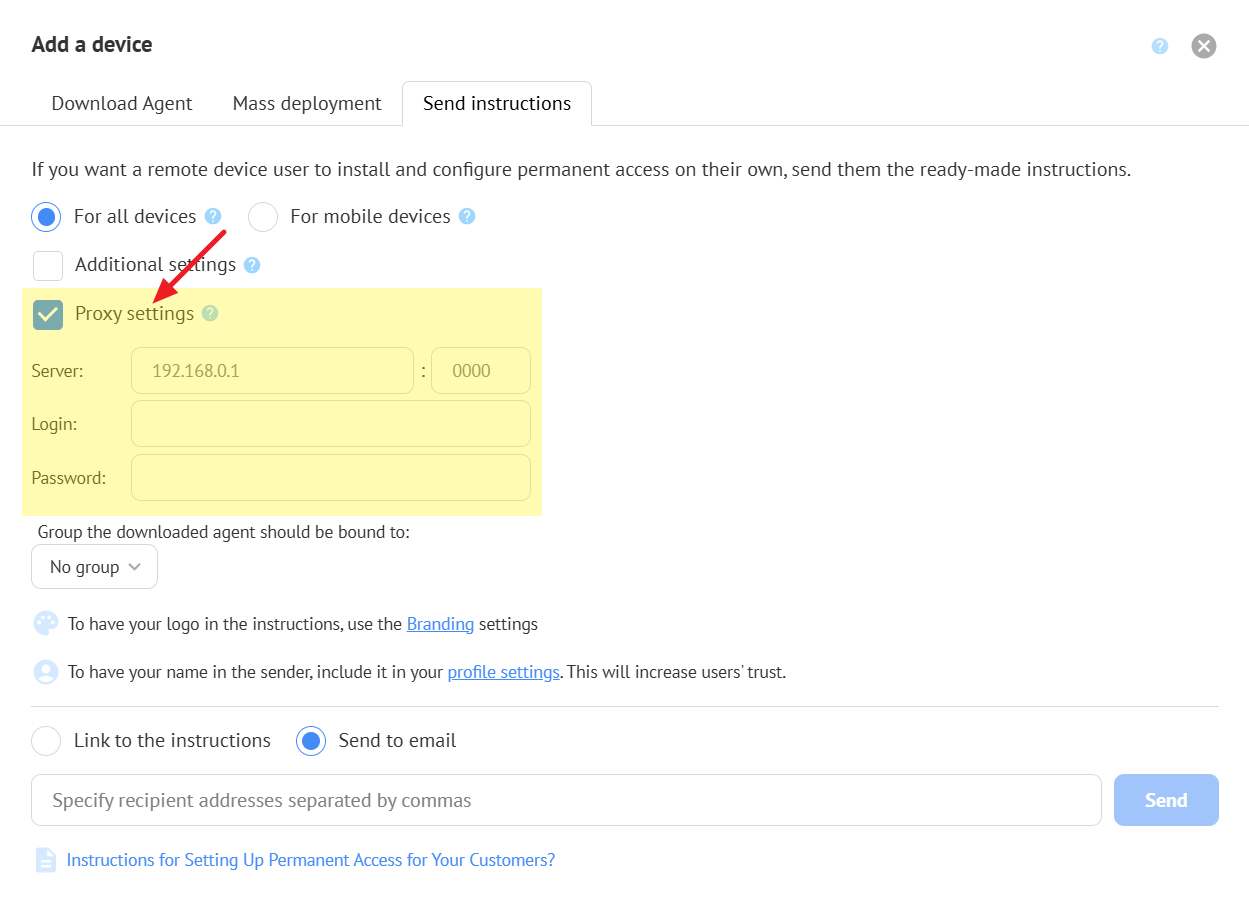If a proxy server is used on the client side, specify the proxy settings (server, port, login and password). They will be automatically displayed in the instruction on the client side.