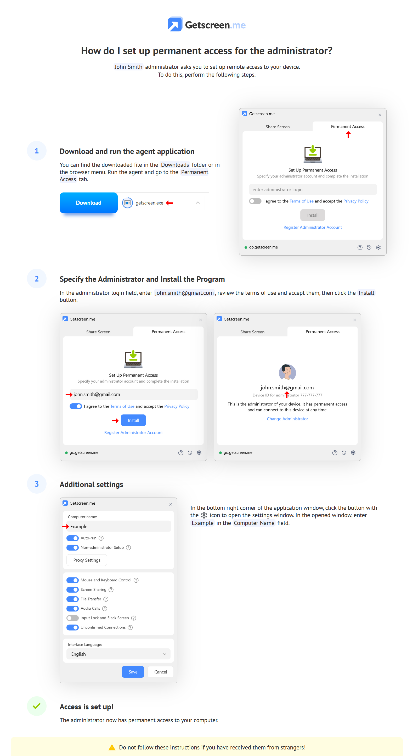 Setting up permanent access implies that a user may not be familiar with the remote access technology. To speed up the connection process, send the user automatic instructions for configuring Permanent Access.