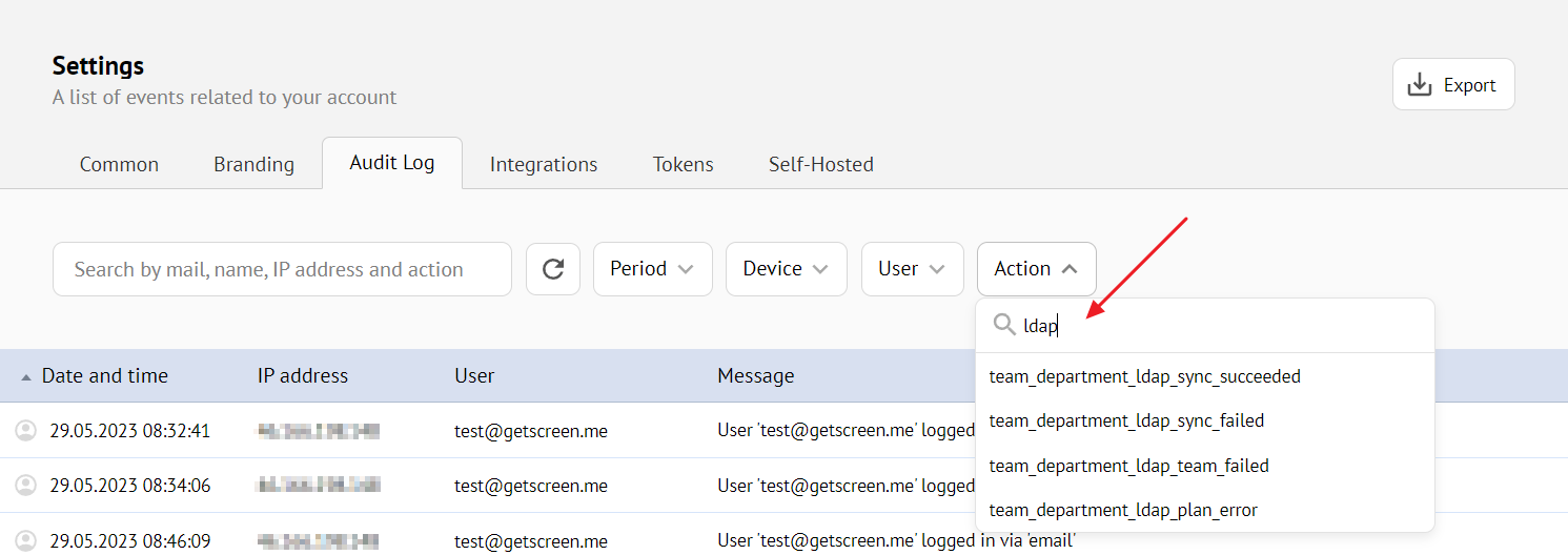 You can find all integration events with the gateway in the general event log. Use actions prefixed with team_department_ldap_* for event filtering: