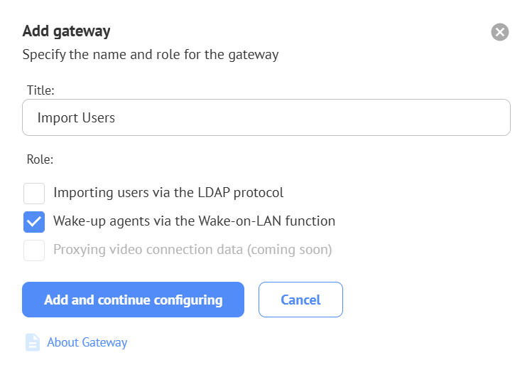 In the pop-up window, enter a name for the gateway, check the box Importing users via the LDAP protocol, and click Continue: