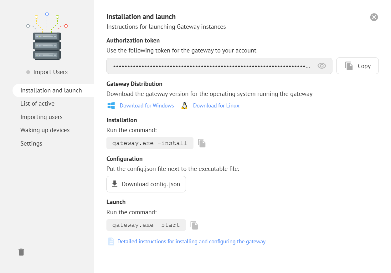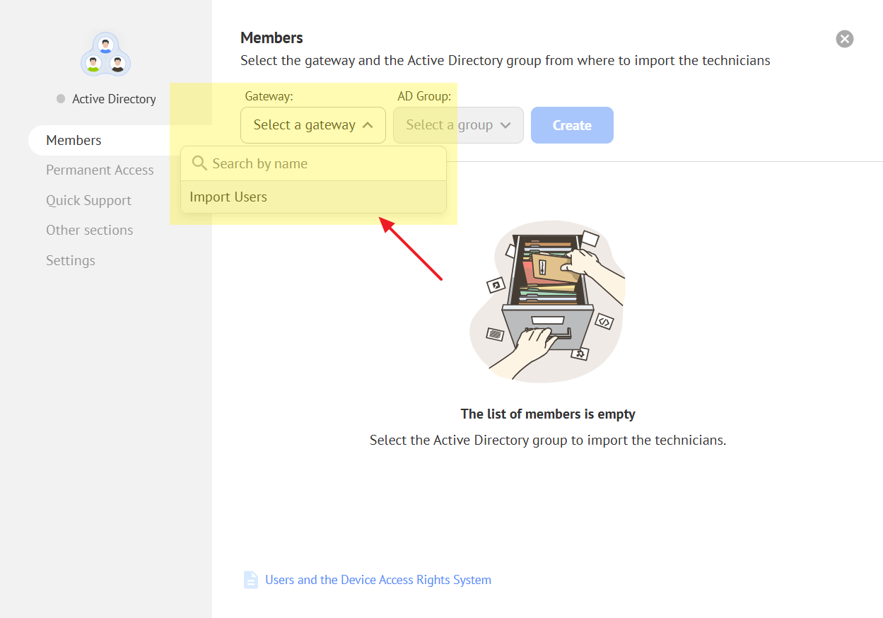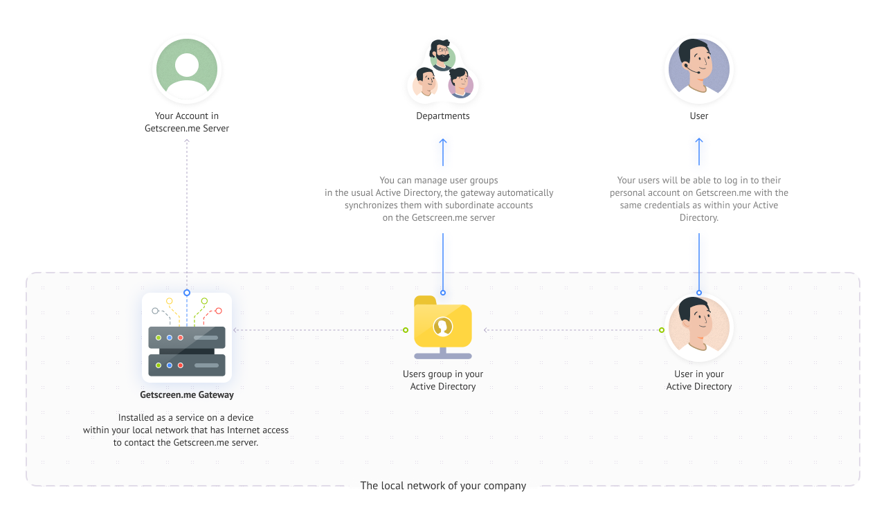 For the integration, you will need to install a gateway program within your local network and grant it access to your Active Directory (hereinafter AD). The gateway will retrieve necessary groups from AD and send user data to the Getscreen.me server. Our server will then add them to your account.