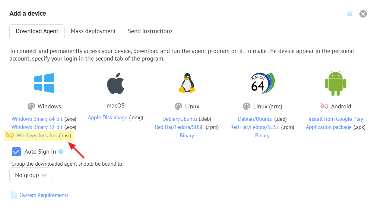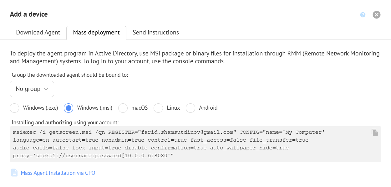 Parameters can be copied from the Personal AccountPermanent accessAdd deviceMass deploymentMSI: