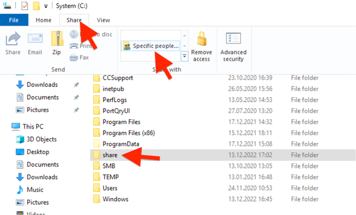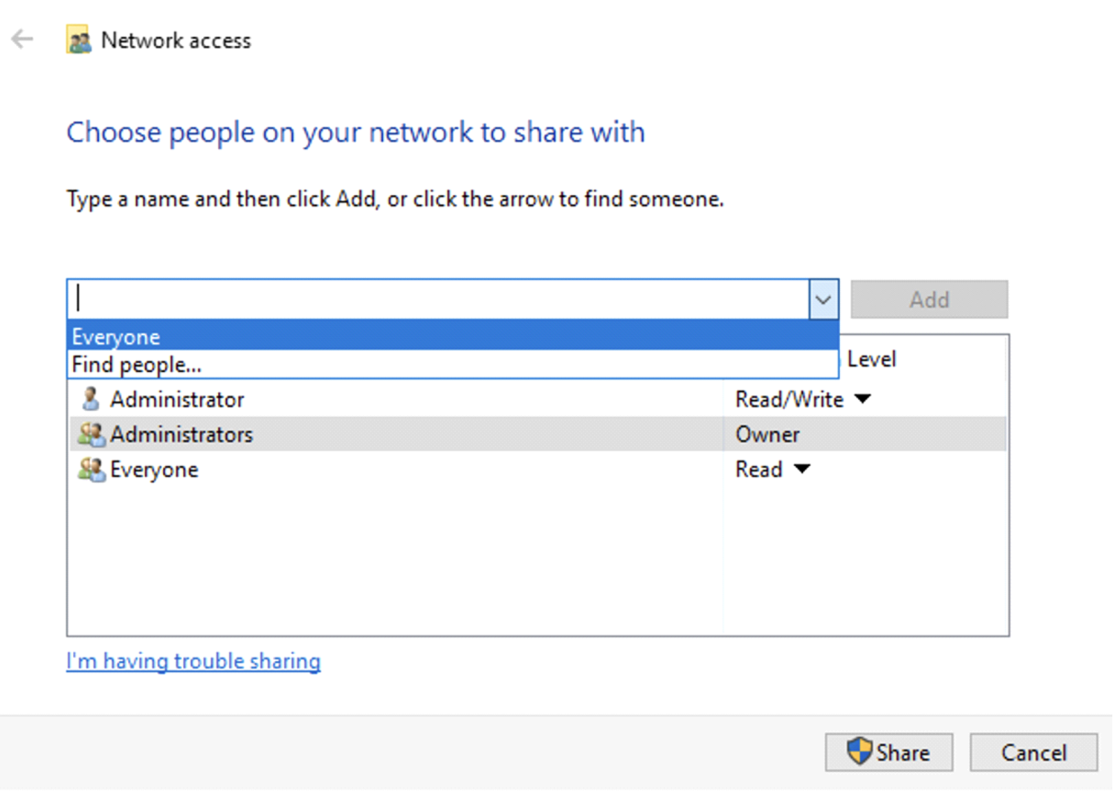 Determine who will have the right to access the directory. In the screenshot Everyone is selected. You can also recommend the option only domain computers, selected from a list.