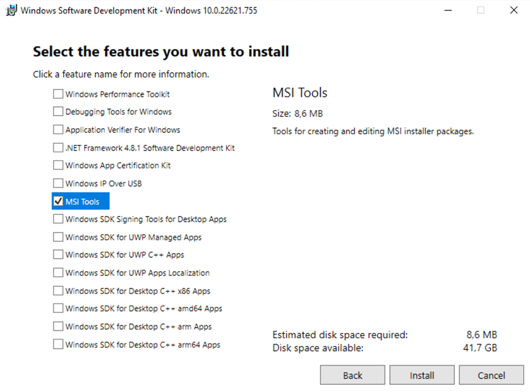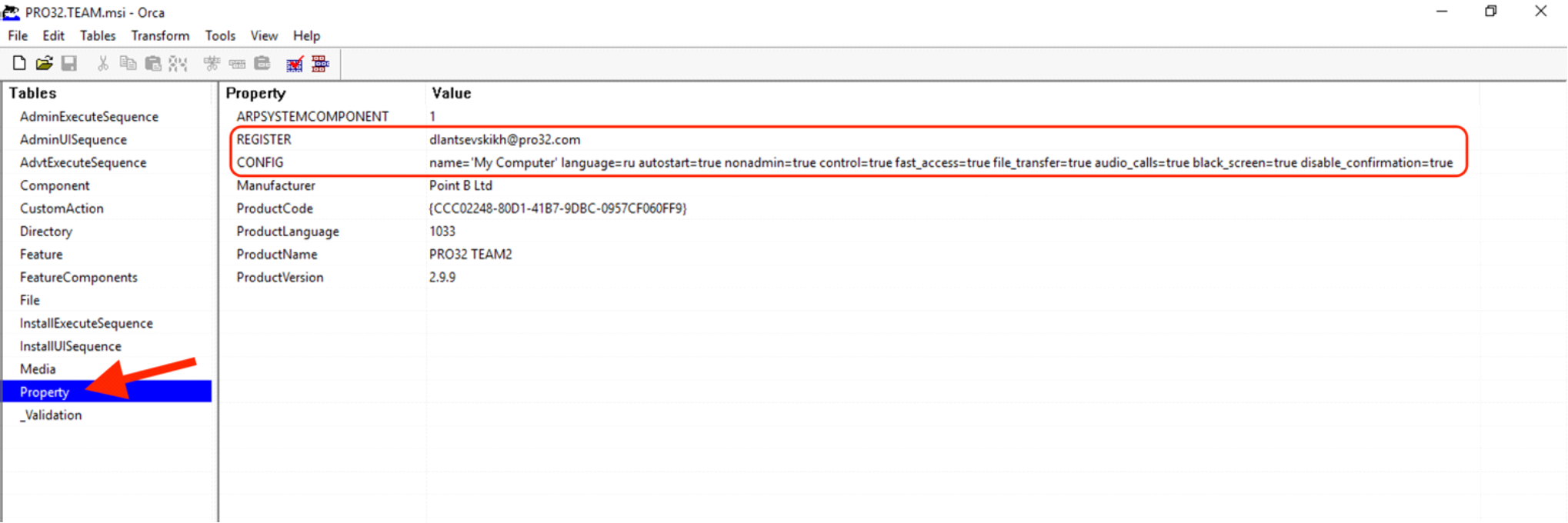 Enter the installation parameters according to the example below, save the changes to the MSI file.