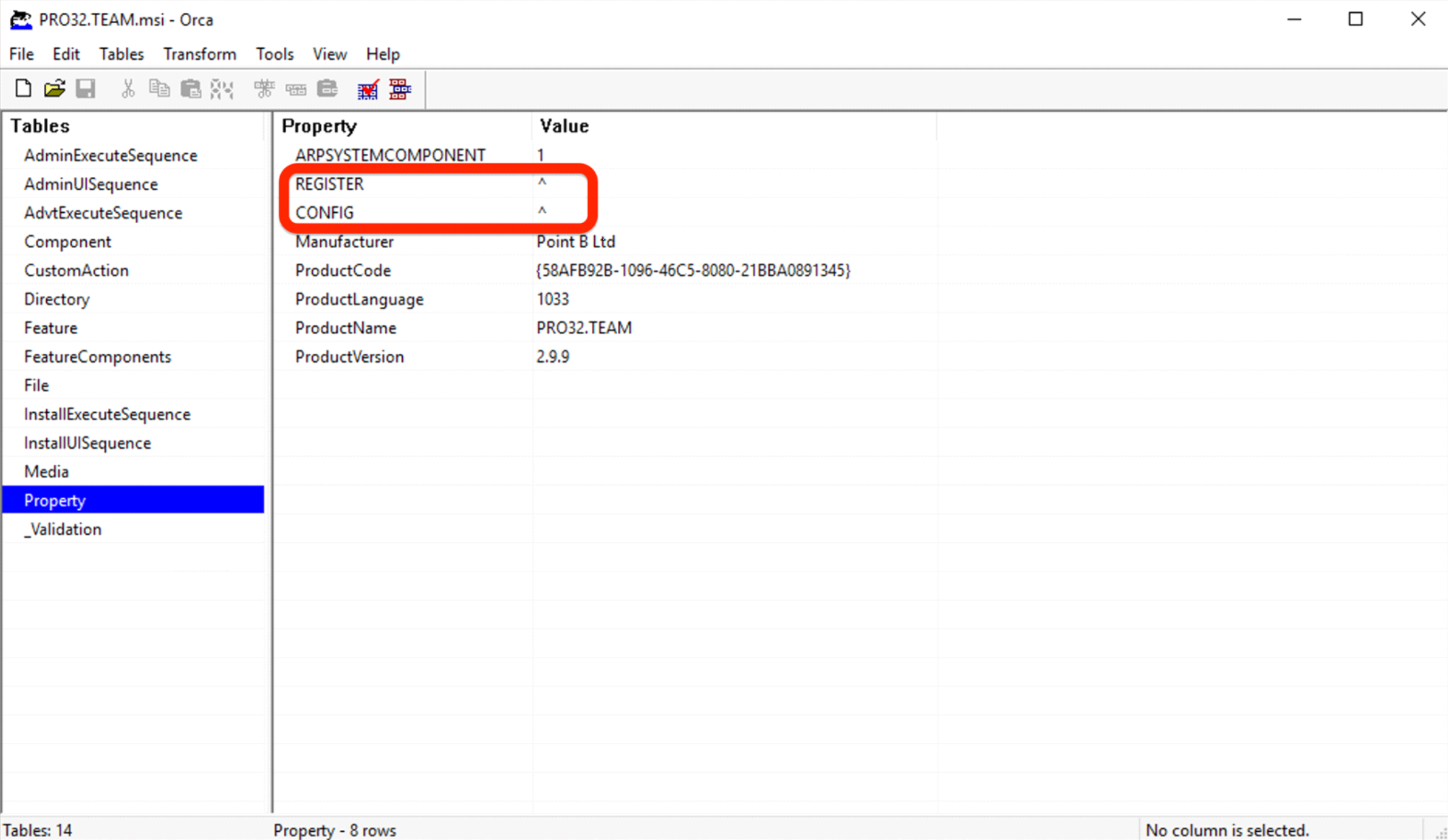 Start Orca and open the MSI file (FileOpen menu), then go to Property: