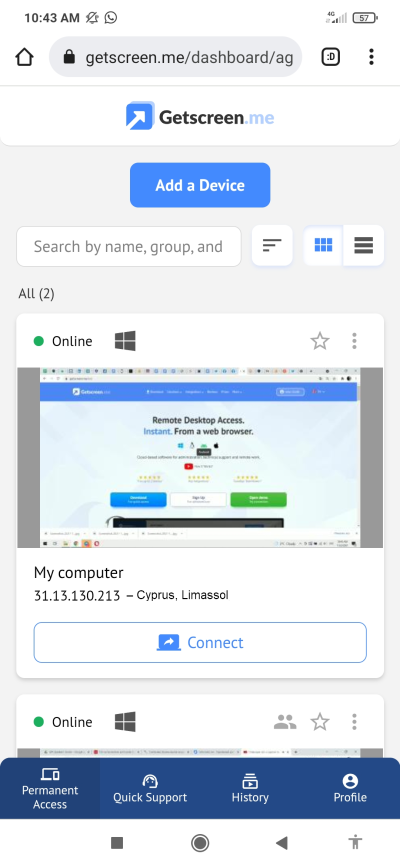 Apart from desktop devices, you can also connect to Android-powered mobile devices by installing Getscreen.me Agent .