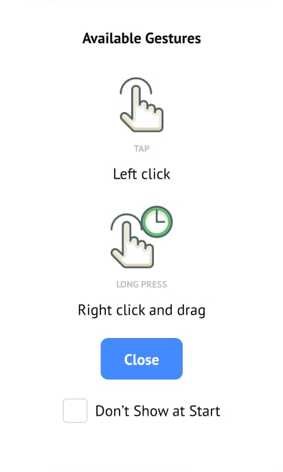 - long tap — right mouse button click, context menu, drag and drop and scrolling.