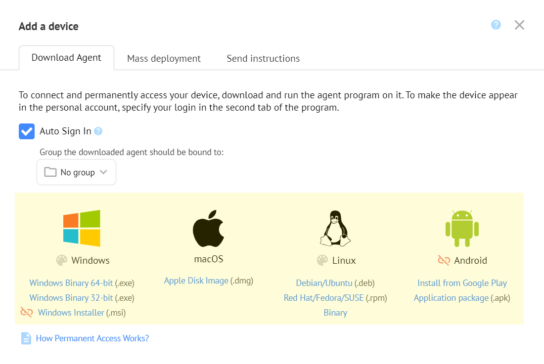 To begin, you need to obtain the agent distribution. On the Permanent Access page in our dashboard, click the "Add Device" button, and you'll find a set of distributions for various operating systems. Select the relevant system and download the distribution file: