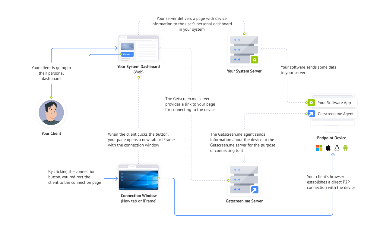 To enable remote access to the devices, you need to install our agent software on the end-user devices and link it to their accounts within our system. Afterward, you can obtain a connection link through our HTTP API and add it to your user dashboard. The process operates as follows:
