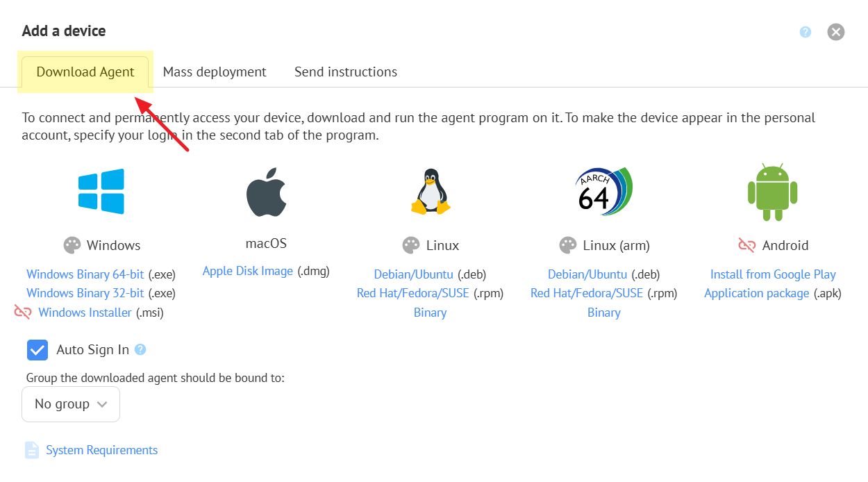You need to download and install the required version of the agent program on the device you want to manage. Choose the version depending on the device's operating system. Currently, systems such as Windows, macOS, Linux, and Android are supported.