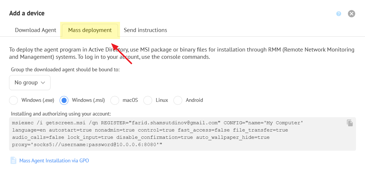 Learn more about mass agent deployment in the article Installing Agents via GPO (Mass Deployment).