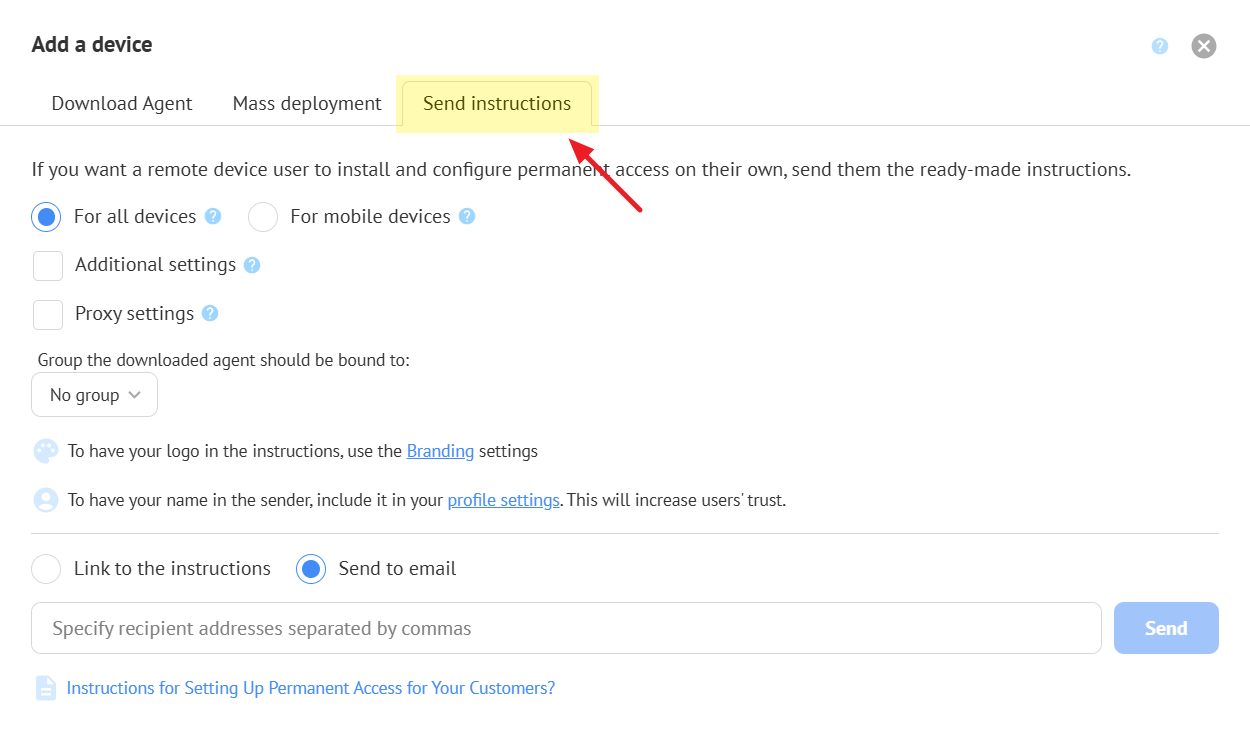 With branding settings, you can give the agent program a personalized corporate style. Learn more on the page Branding for Remote Desktop.
