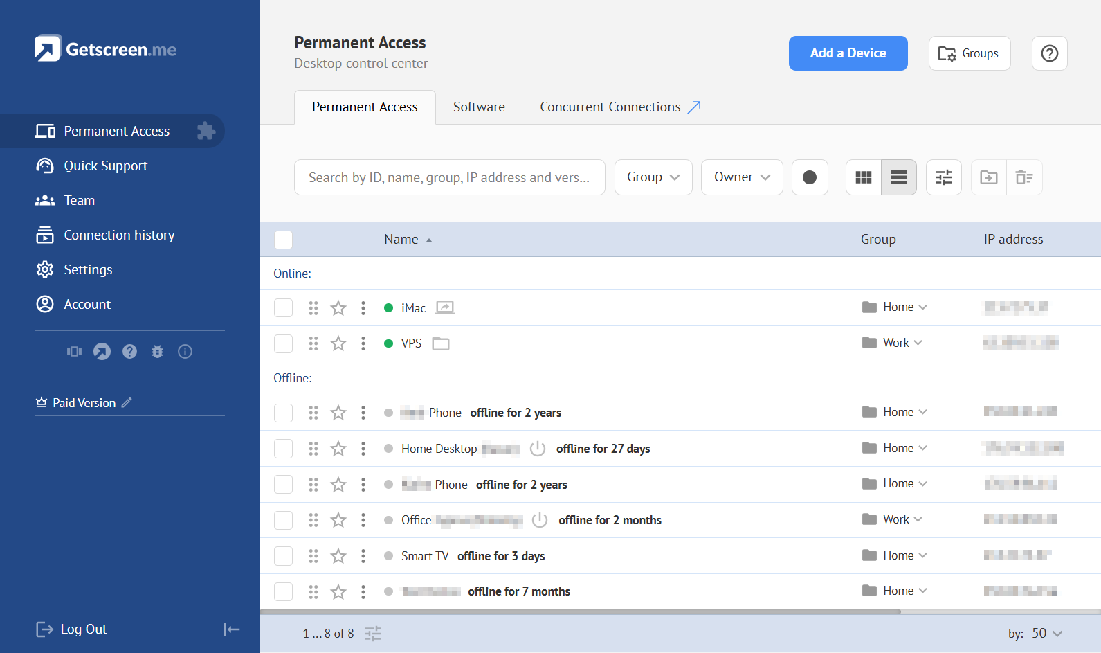 To connect to devices, you need to go to the Permanent Access section and click the connection button either directly from the list or from the device card: