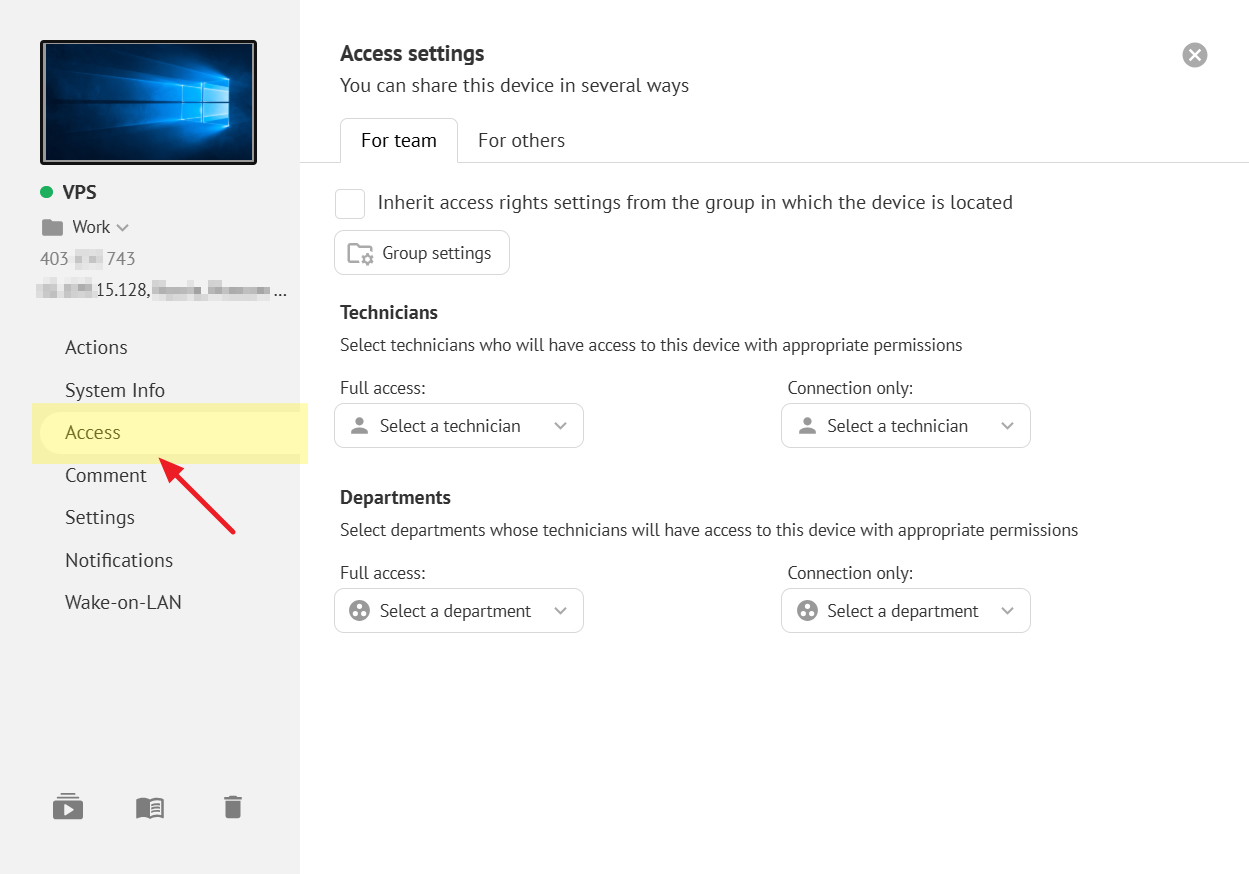 When working with a large number of devices, you can organize them into groups. Using groups, you can grant access to devices to other technicians and apply various settings for the agent program. Learn more about groups in a separate guide Device Grouping.