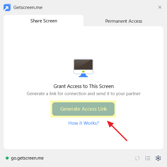 After downloading, you need to launch the agent program. In the Share Screen tab, click the Generate Access Link button.