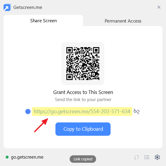 After clicking, you will receive a link that must be shared with the remote user. The link will also be copied to your clipboard.