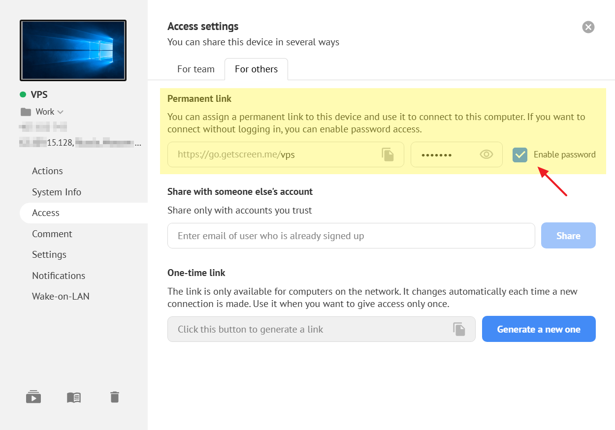 Open the device card and navigate to the Access subsection under the For others tab. In the Permanent Link block, check the Enable password box and set a strong password. Then copy the link and share it with your remote partner. When following the link, they will need to enter the password you specified. If necessary, you can also change the path in the link.