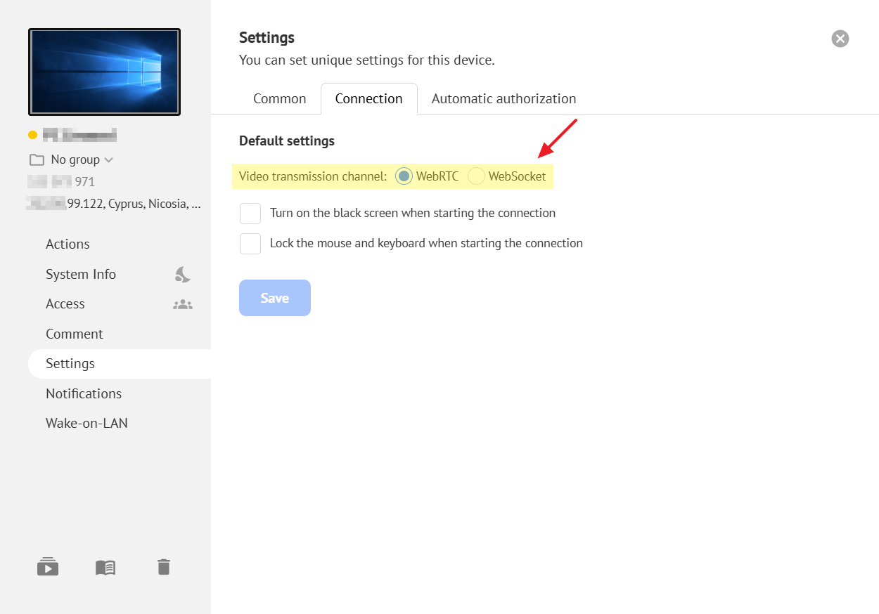If you find that the WebSocket channel provides better quality in your environment, you can set it as the default for a specific device. To do this, open the device card, go to the Settings tab → Connection, and set the Video Transmission Channel field to WebSocket.