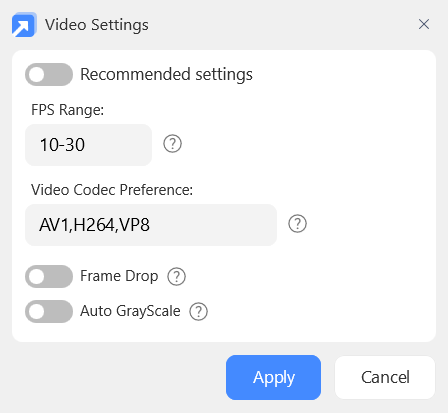 You can configure all of these encoding settings individually for each device. To do so, open the agent application settings, go to Video Settings, and adjust the recommended parameters.
