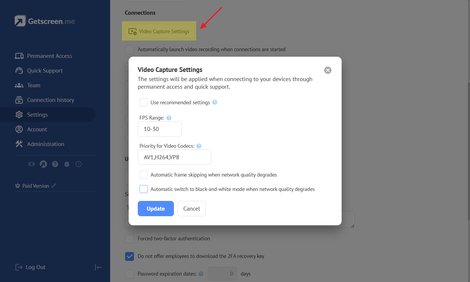When connecting to a device in remote desktop control mode, the screen image from the remote device is transmitted as a video stream. To achieve high-quality video, stable network conditions are required — but these are not always available. For this reason, we provide several settings that allow you to adjust video transmission according to your current network conditions.