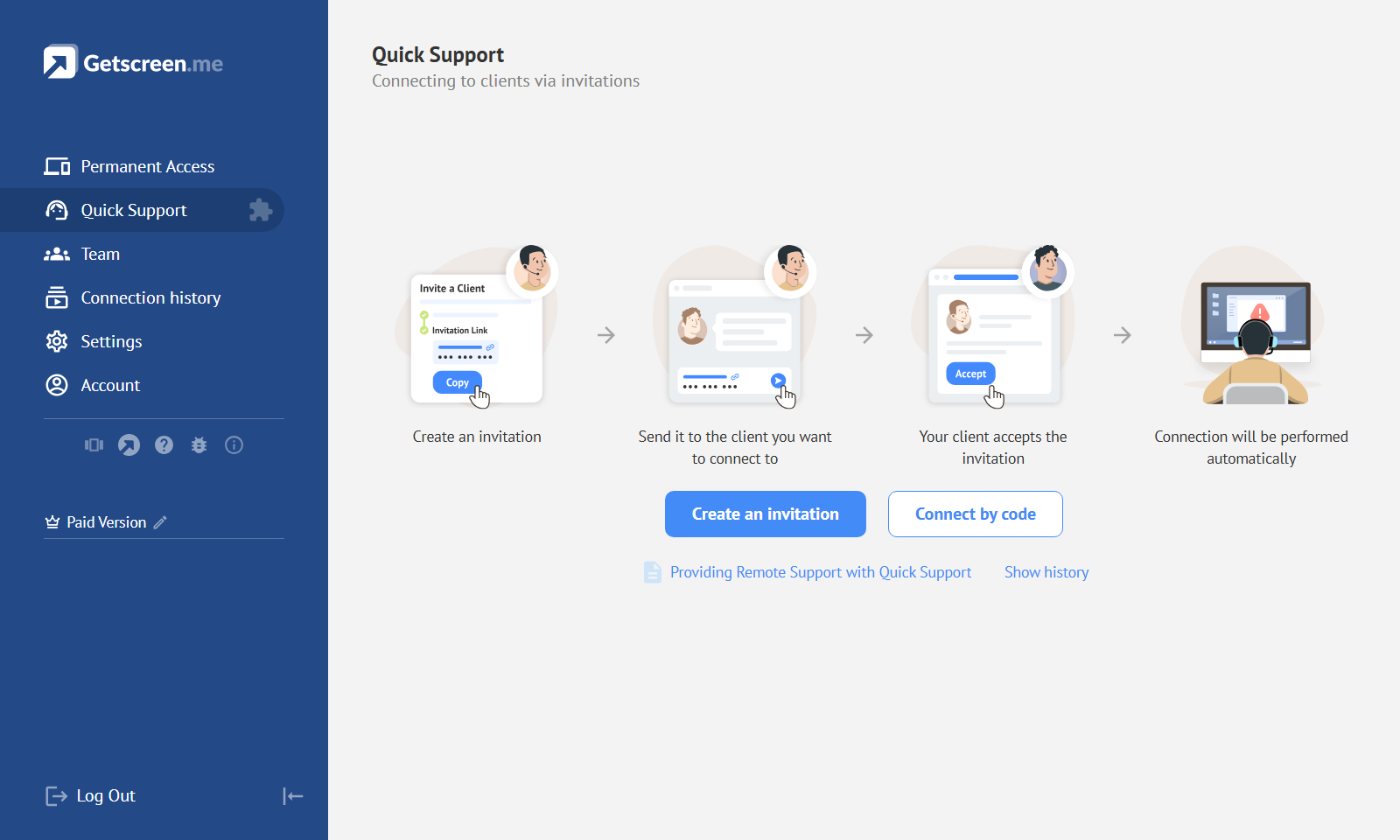 Quick Support is a special method for one-time connections with occasional clients using invitations and one-time codes. Invitations are created by technicians and sent to clients, while one-time codes are generated by clients and sent to technicians. In both cases, the connection is established automatically.