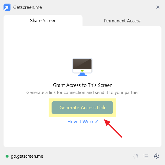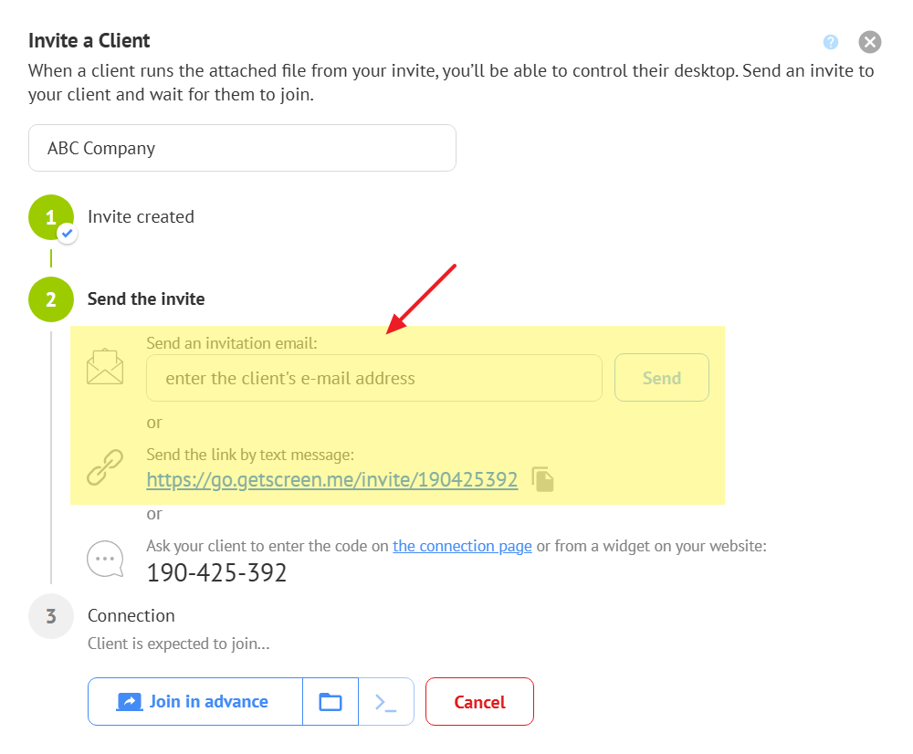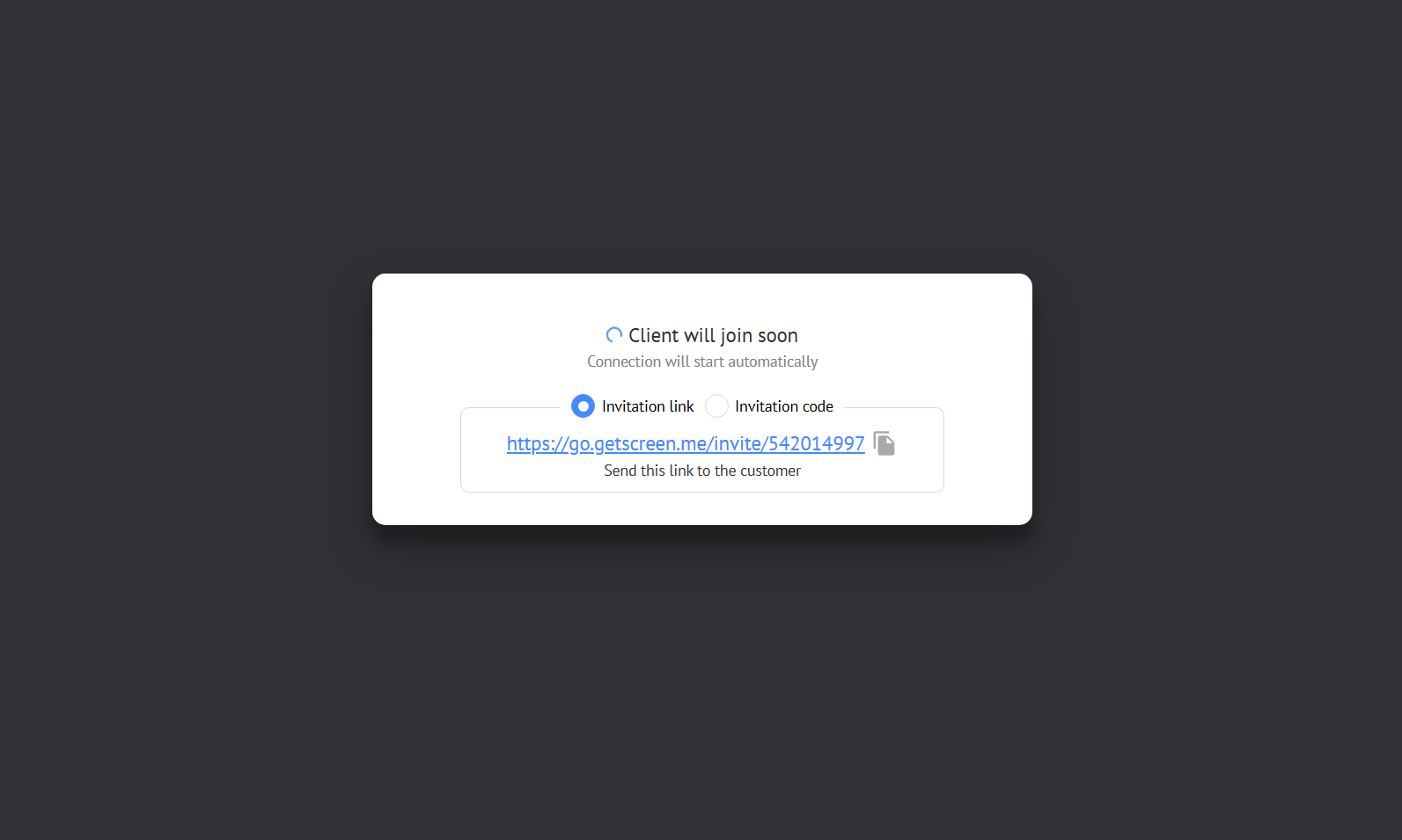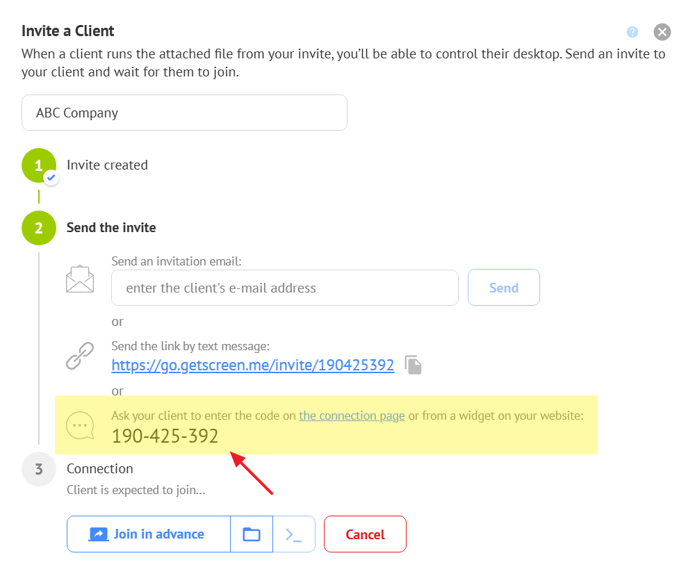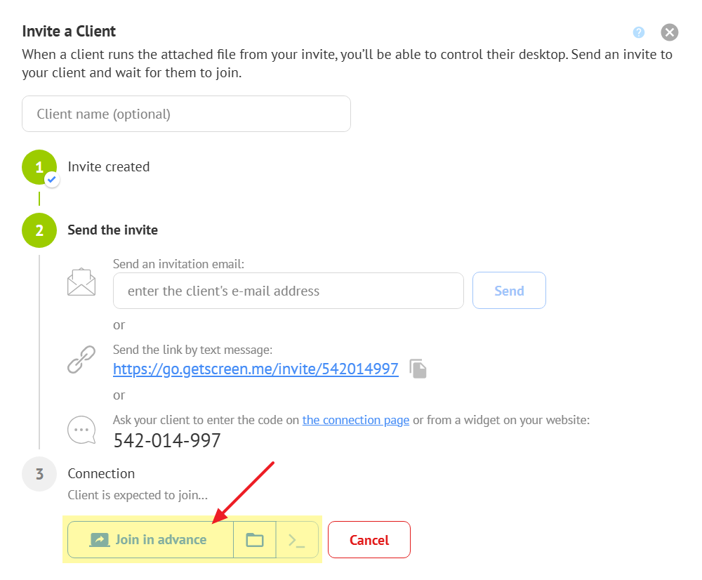This type of connection is used when you want the client to invite the technician, rather than the other way around. This approach is common in other remote access software.