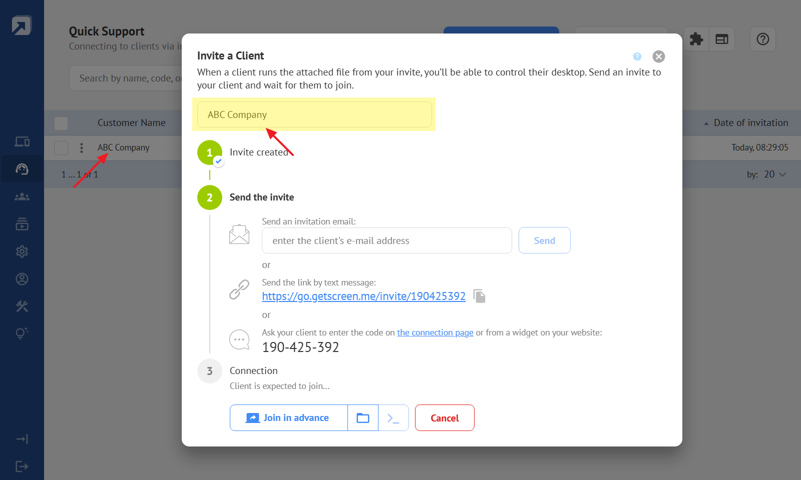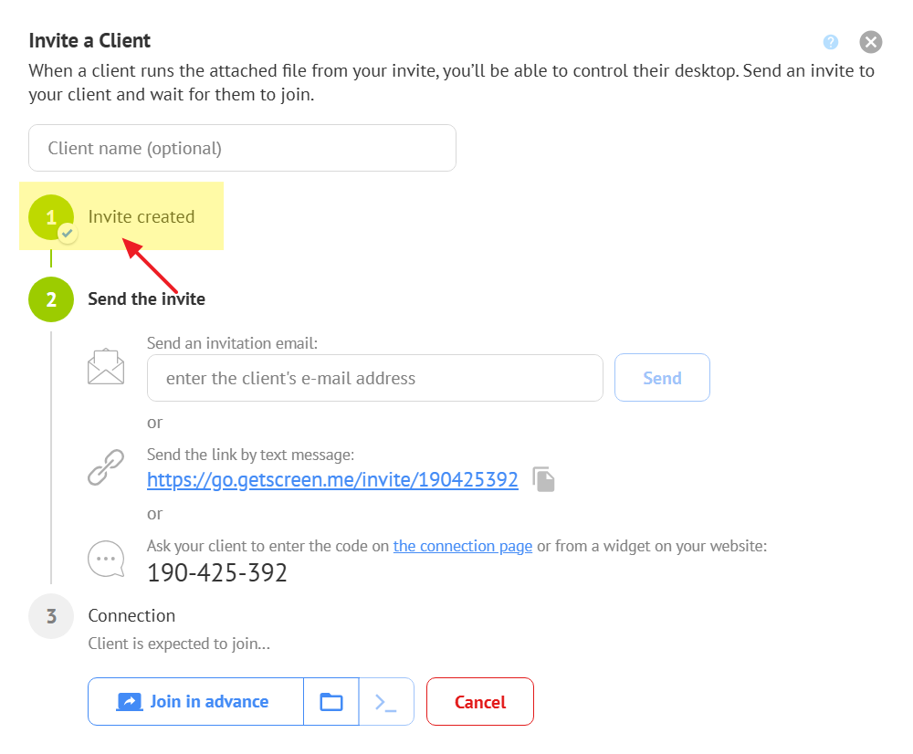 Invitations are created by technicians and sent to clients. Clients open the invitation, download and run the attached agent file. The connection is then initialized automatically.