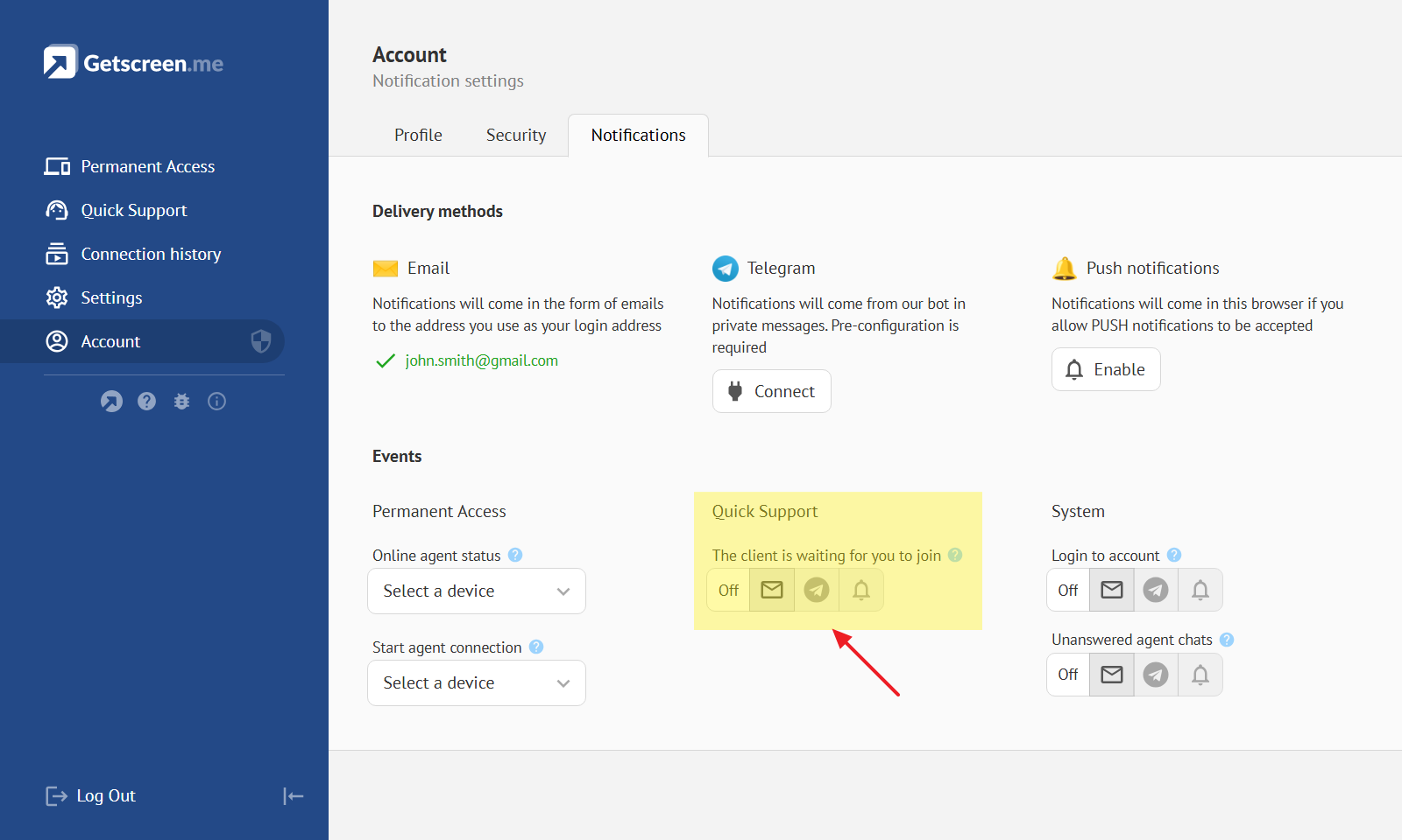 With Telegram, you can set up notifications when a client connects and even create invitations using quick commands. Learn more in the article Remote Desktop Access via Telegram.
