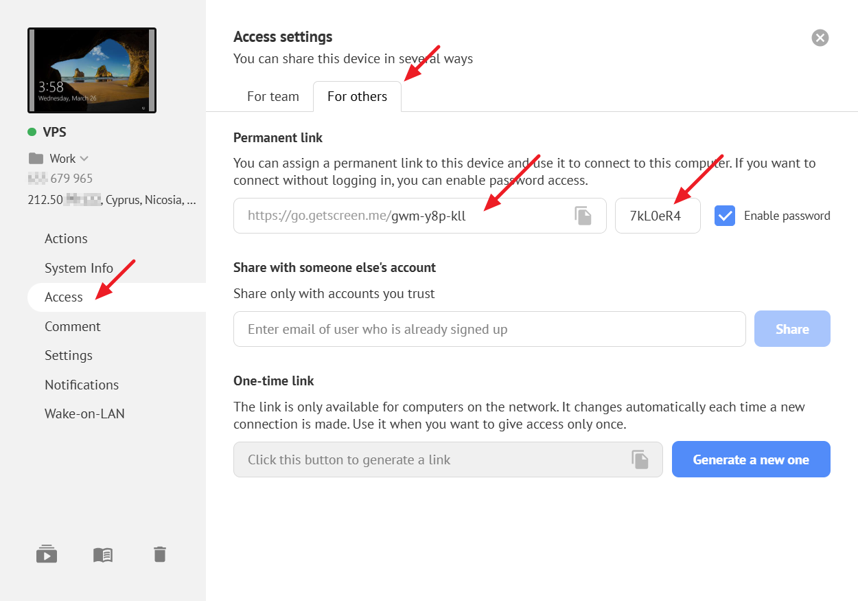 First, go to your Getscreen.me Account and select the device you want to connect to from RDM. Then, open the Access tab, navigate to For others, and enable public access via a permanent link.