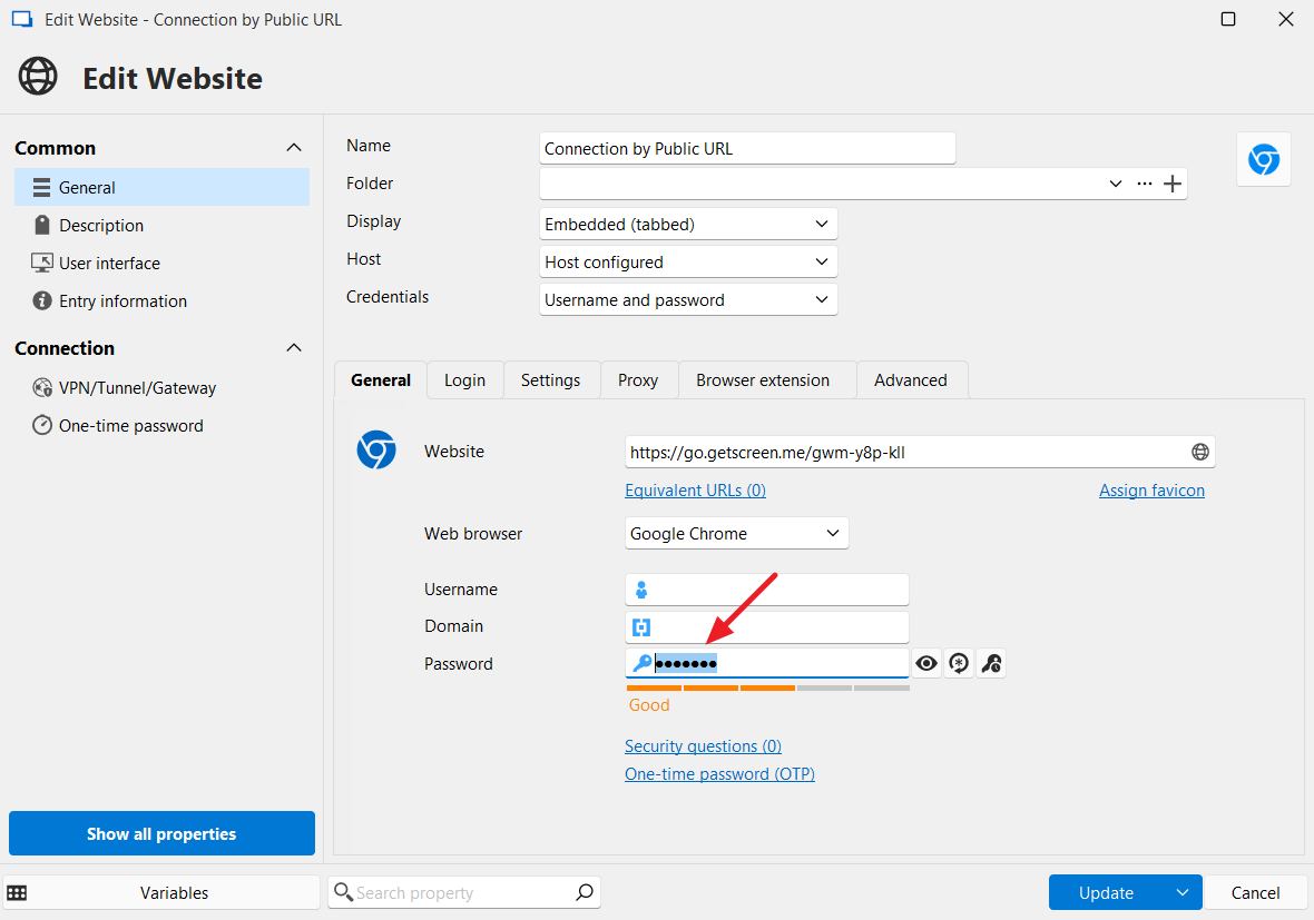 - Paste the permanent link from the Getscreen.me device card into the Website field.