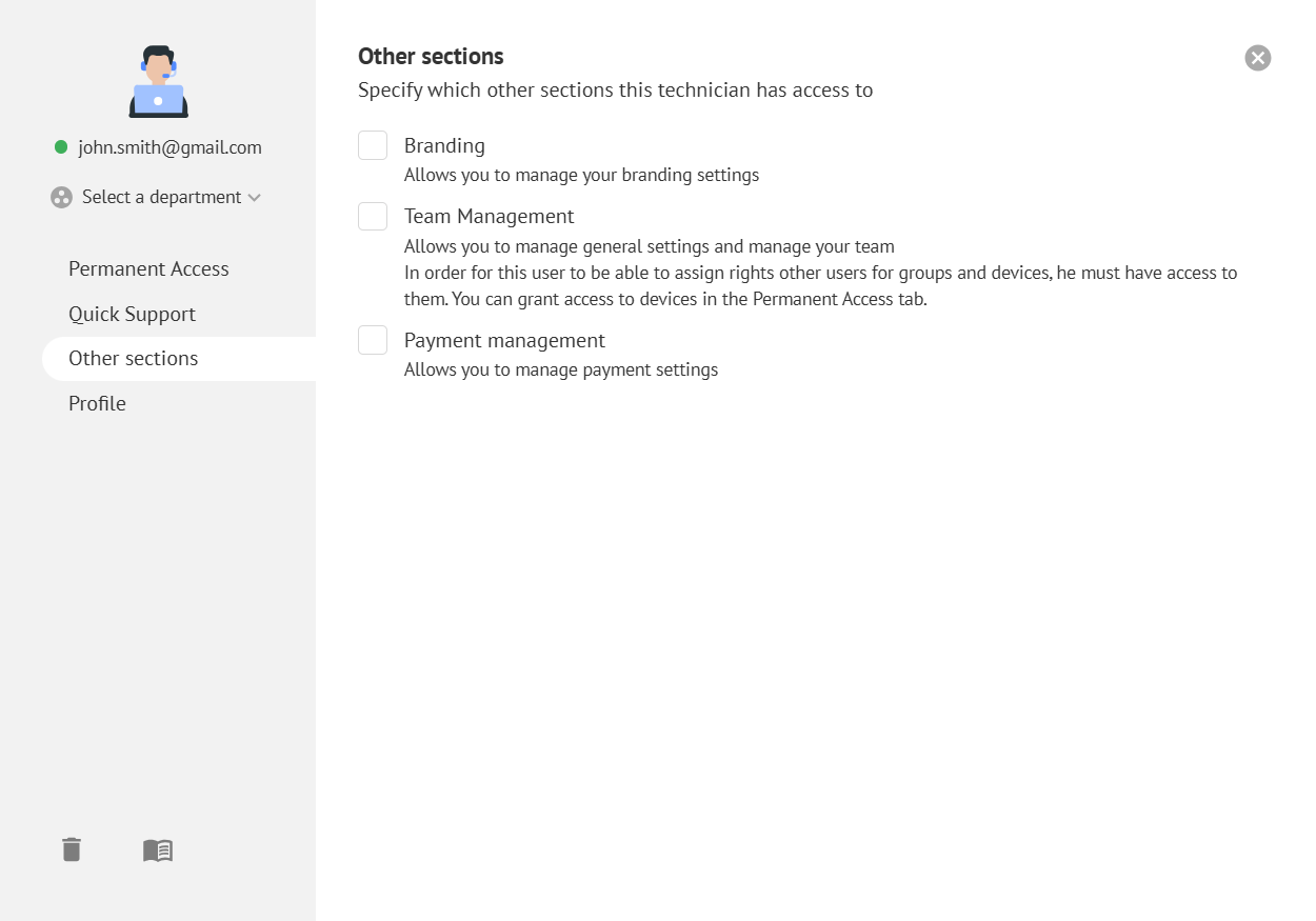 Allows the technician to manage the team’s user list: invite and remove other technicians, and assign device or group access (within their own permissions).