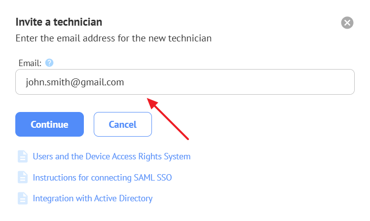 In the self-hosted version, you can create technician accounts without sending an email invitation — just set a predefined login and password. Learn more about the capabilities of the Self-Hosted version on this page .