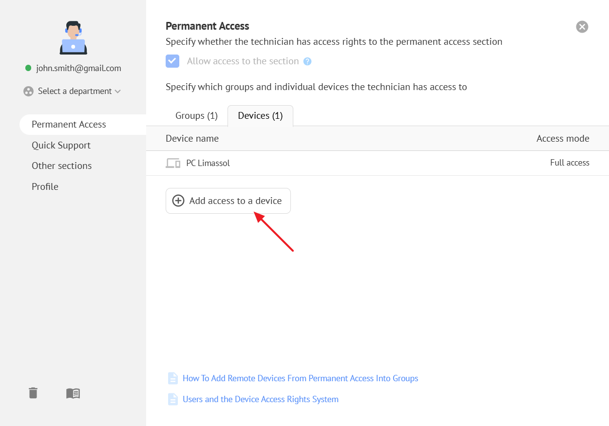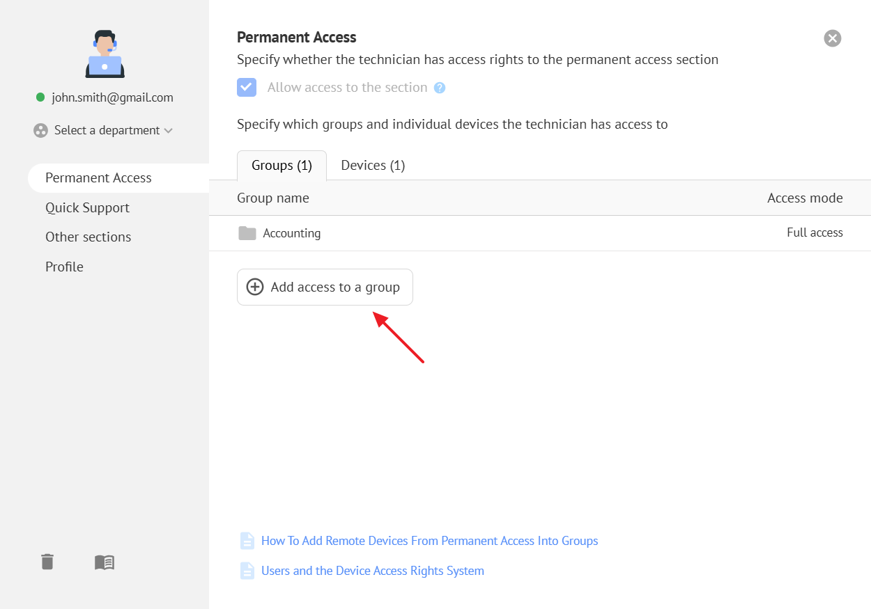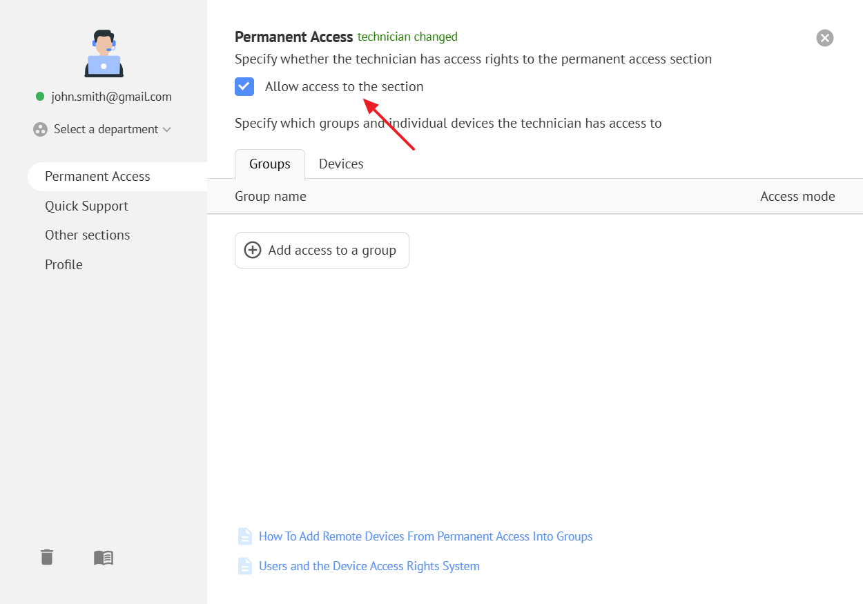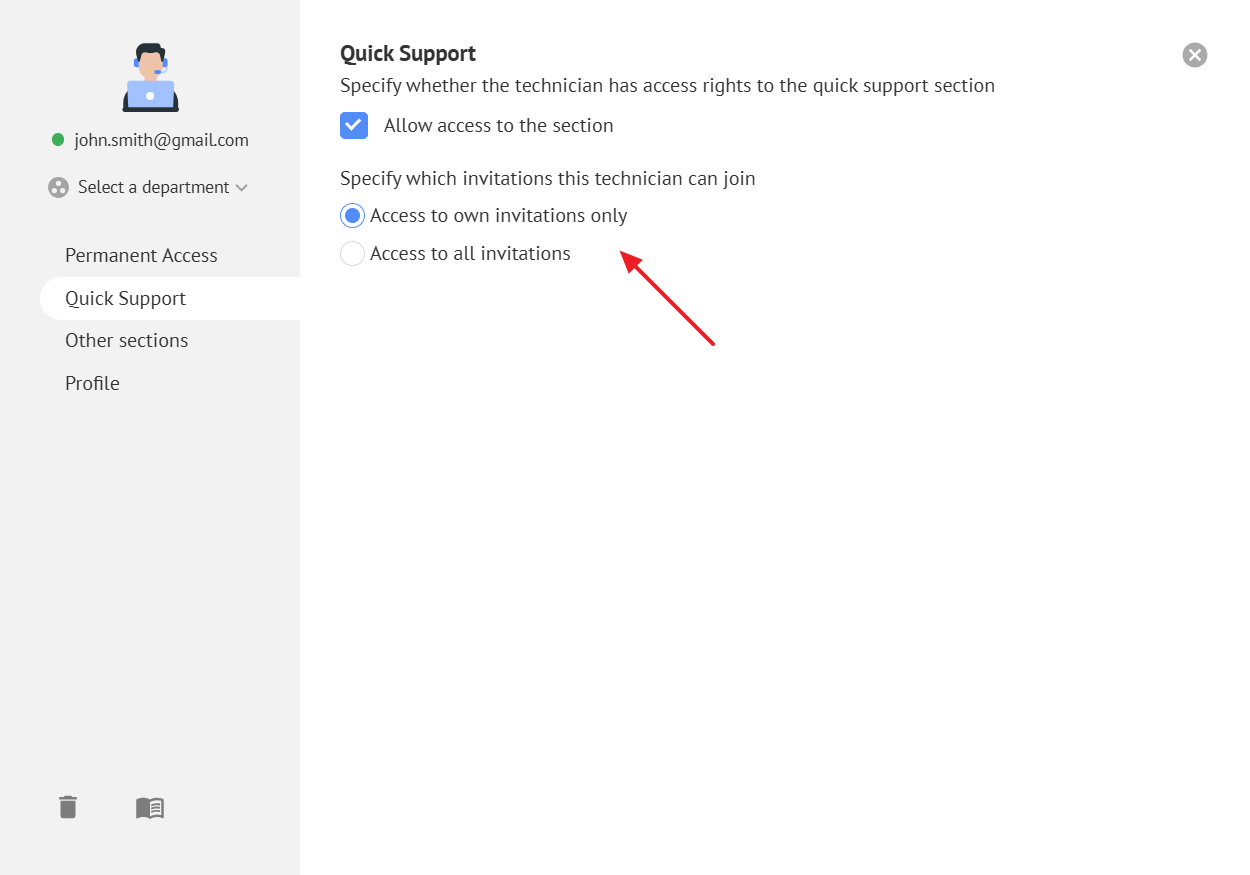 You can allow or block access to the Quick Support section, which handles customer sessions via one-time invitations.