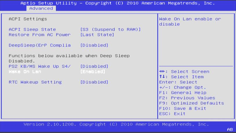 In the BIOS settings, find the Wake-on-LAN option and enable it: