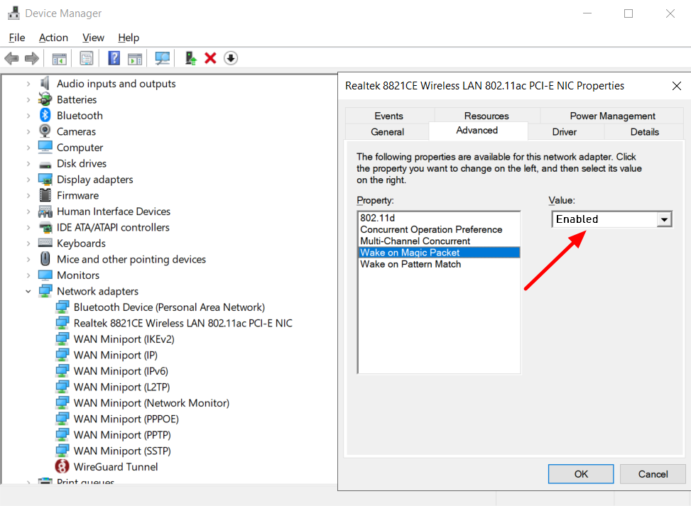 Right-click the adapter. In the new window, go to the Advanced tab and find the option Wake on Magic Packet. Make sure it’s enabled.